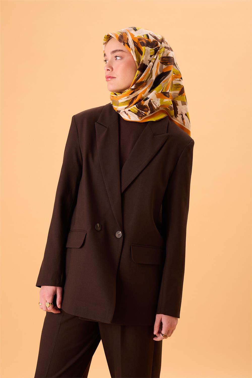 Organik pamuk ipek eşarp dokuması ile üretilen bu model, asit yeşili, turuncu, acı kahve, siyah ve gri tonlarının desenli birlikteliğiyle güçlü ve dengeli bir renk kompozisyonu sunar. Tok duruşlu eşarp yapısı sayesinde bağlandıktan sonra formunu korur ve gün boyu düzenli bir görünüm sağlar.