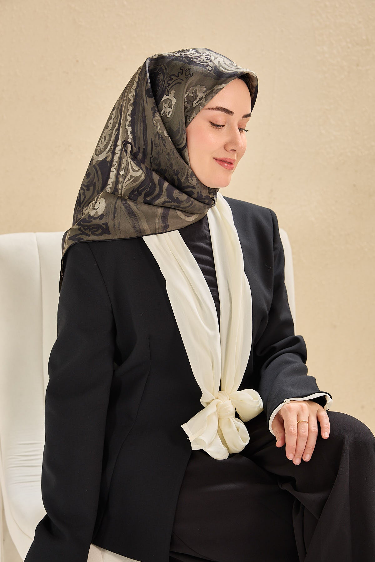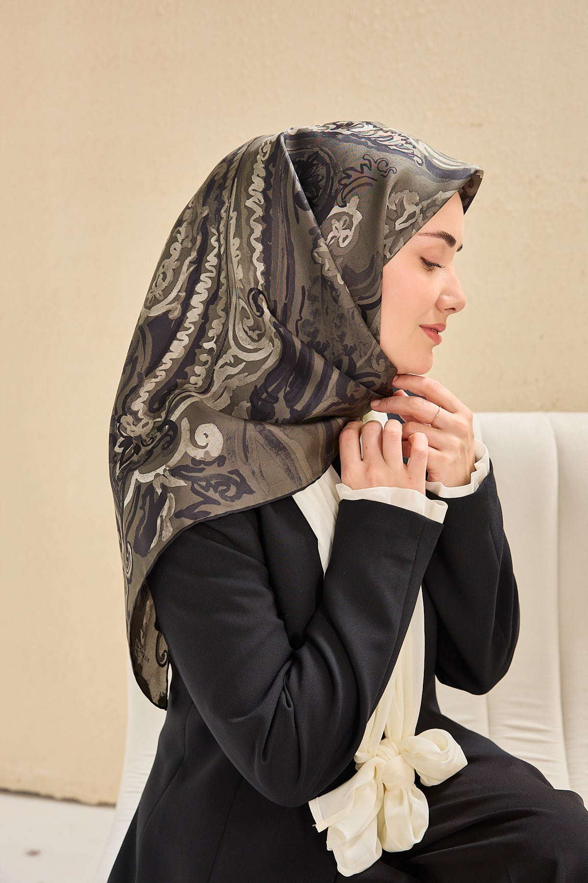 Antrasit, siyah, haki, krem tonlarının doğal uyumunu yansıtan bu twill ipek eşarp, tok duruşlu yapısıyla gün boyu formunu korumak isteyen kullanıcılar için ideal bir seçimdir. Twill dokumasının sunduğu kaymaz kumaş özelliği, eşarbın başta kolay şekil almasını sağlar ve gün içinde kayma hissini en aza indirir.