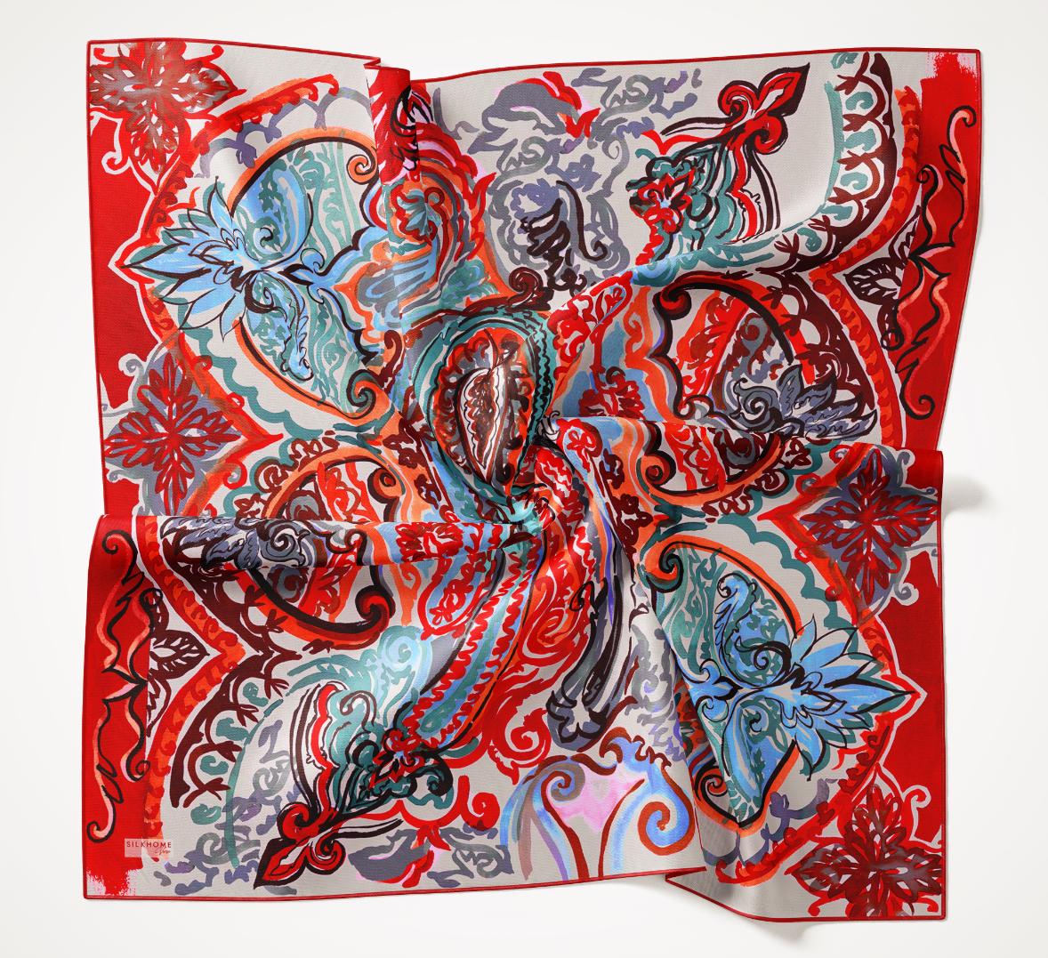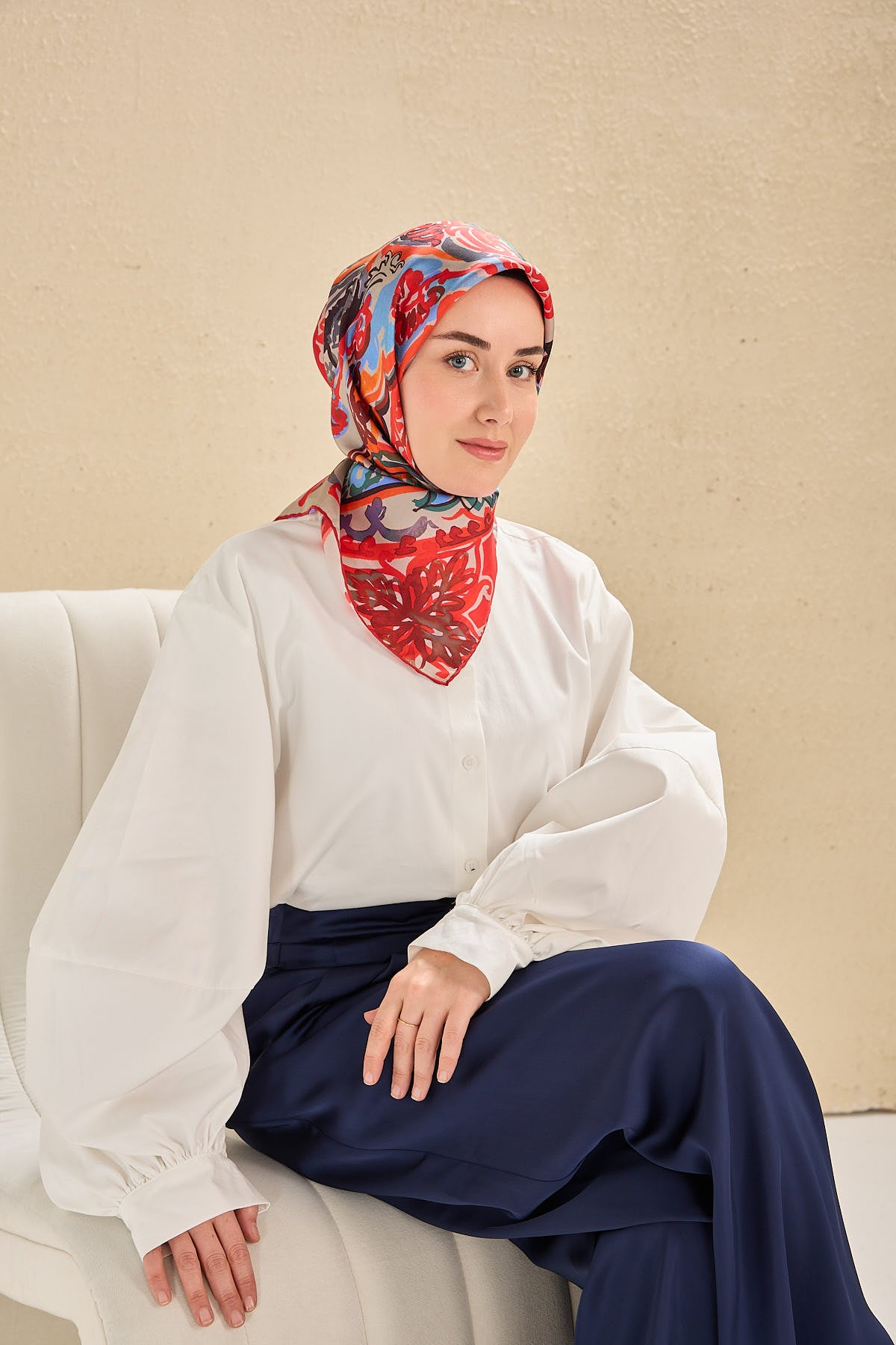 Kırmızı, açık mavi, zümrüt yeşili, turuncu, mürdüm, pastel kırmızı tonlarının doğal uyumunu yansıtan bu twill ipek eşarp, tok duruşlu yapısıyla gün boyu formunu korumak isteyen kullanıcılar için ideal bir seçimdir. Twill dokumasının sunduğu kaymaz kumaş özelliği, eşarbın başta kolay şekil almasını sağlar ve gün içinde kayma hissini en aza indirir.
