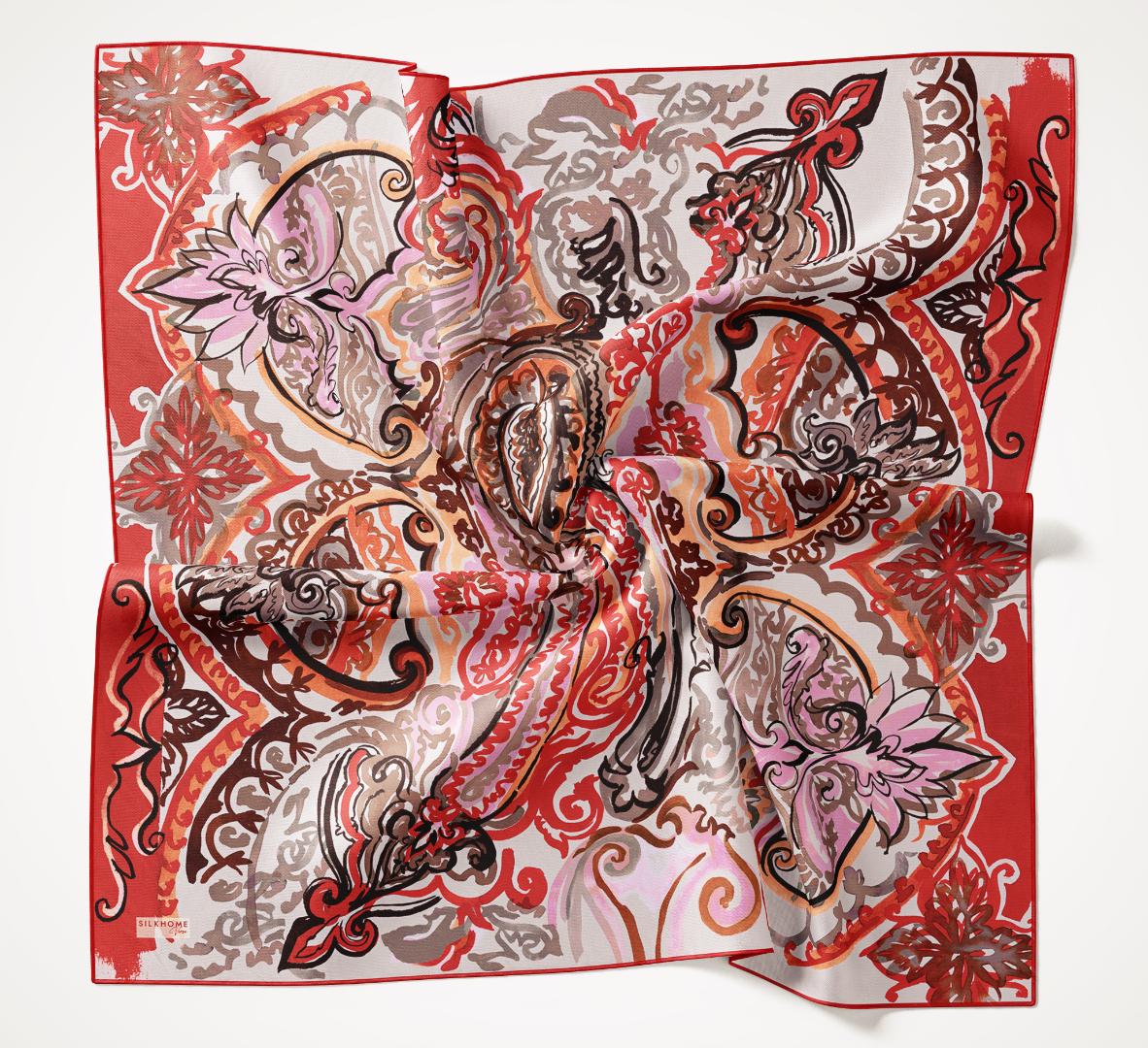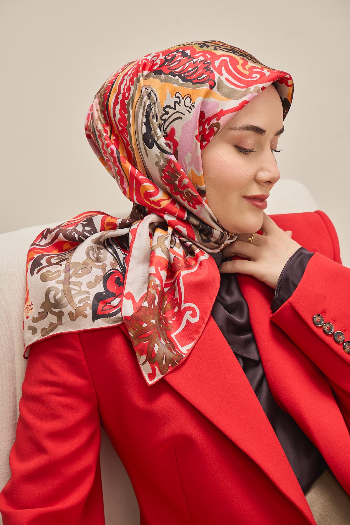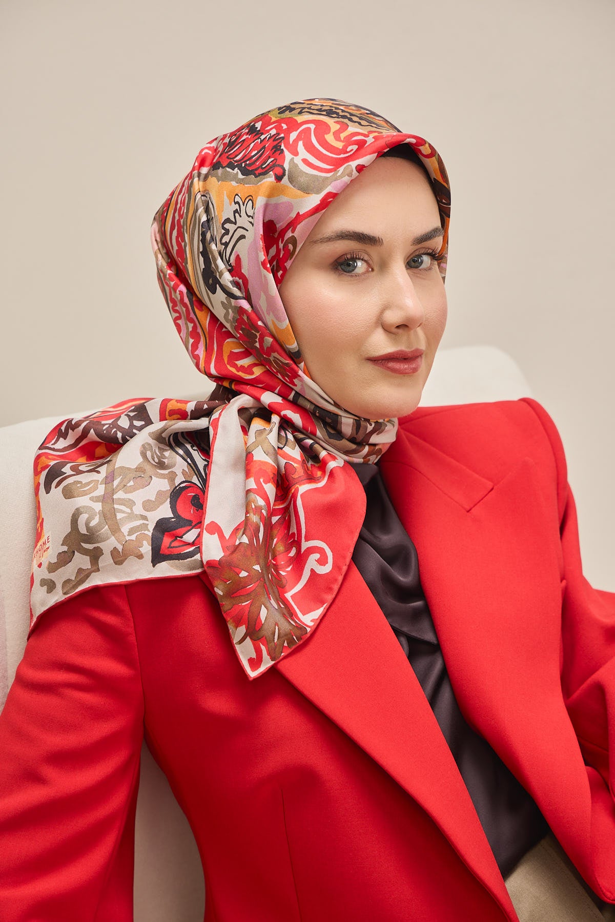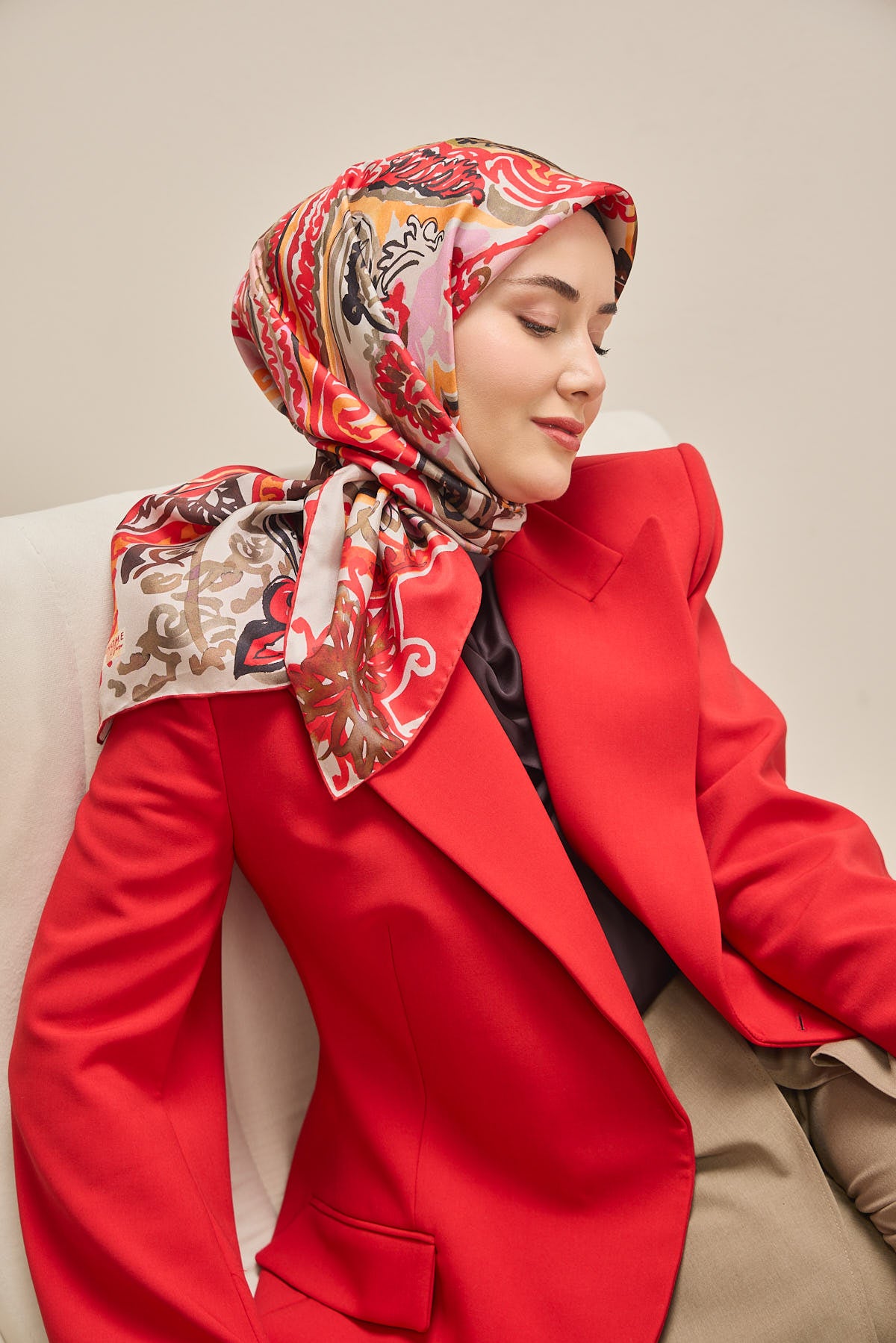Kırmızı, toz pembe, turuncu, vizon, siyah, krem ve kahve tonlarının doğal uyumunu yansıtan bu twill ipek eşarp, tok duruşlu yapısıyla gün boyu formunu korumak isteyen kullanıcılar için ideal bir seçimdir. Twill dokumasının sunduğu kaymaz kumaş özelliği, eşarbın başta kolay şekil almasını sağlar ve gün içinde kayma hissini en aza indirir.
