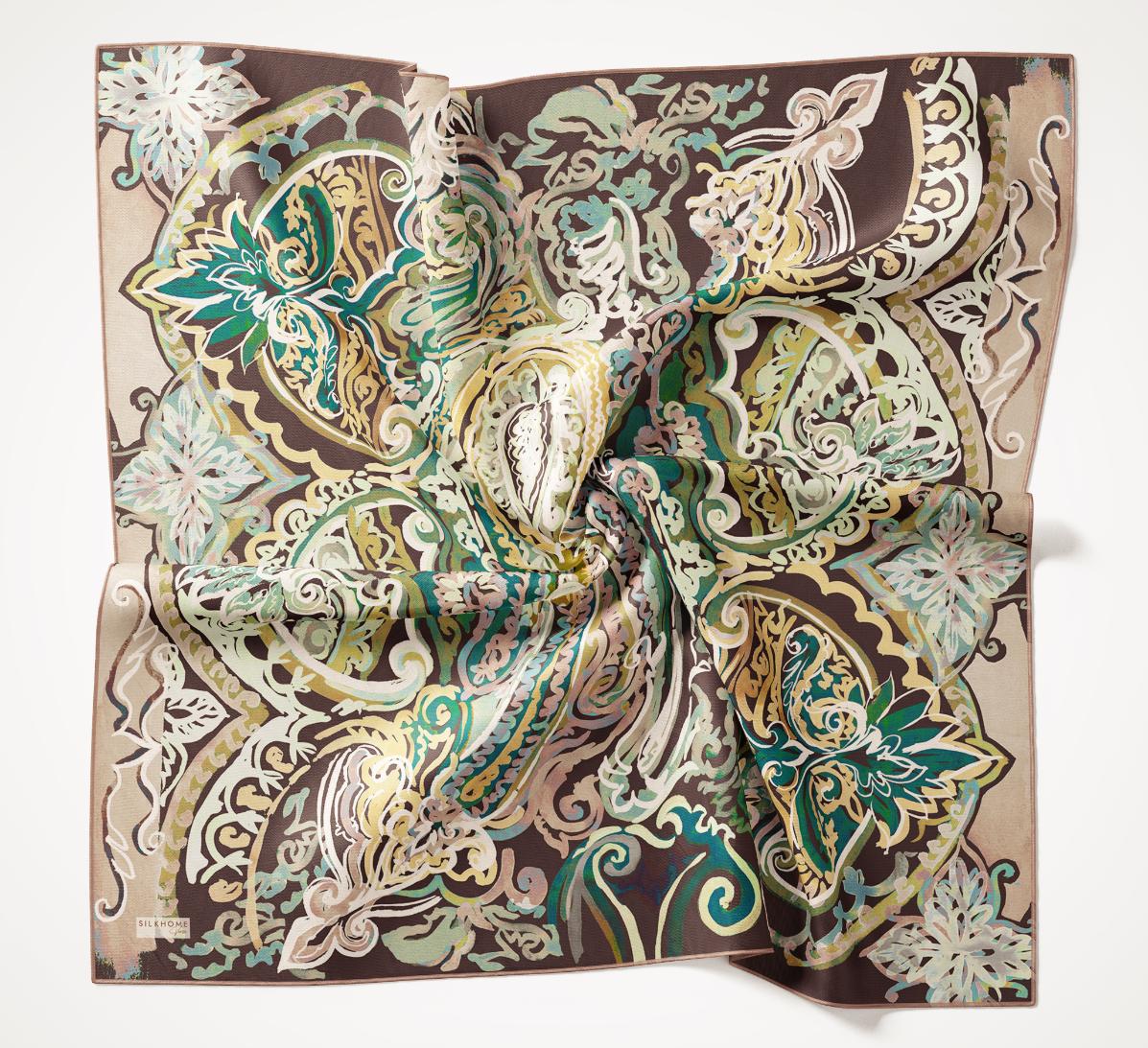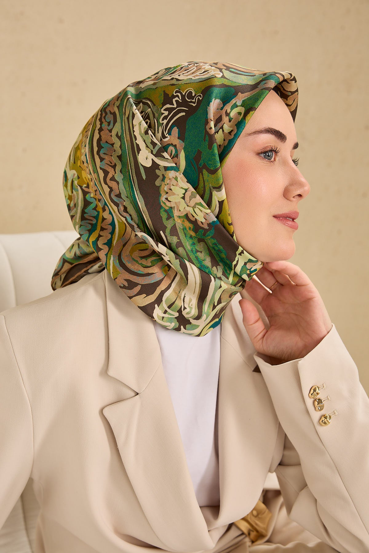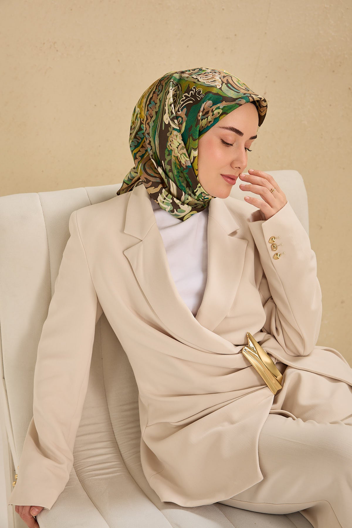 Koyu yeşil, yeşil, mocha, turkuaz, hardal, pastel yeşil ve krem tonlarının doğal uyumunu yansıtan bu twill ipek eşarp, tok duruşlu yapısıyla gün boyu formunu korumak isteyen kullanıcılar için ideal bir seçimdir. Twill dokumasının sunduğu kaymaz kumaş özelliği, eşarbın başta kolay şekil almasını sağlar ve gün içinde kayma hissini en aza indirir.