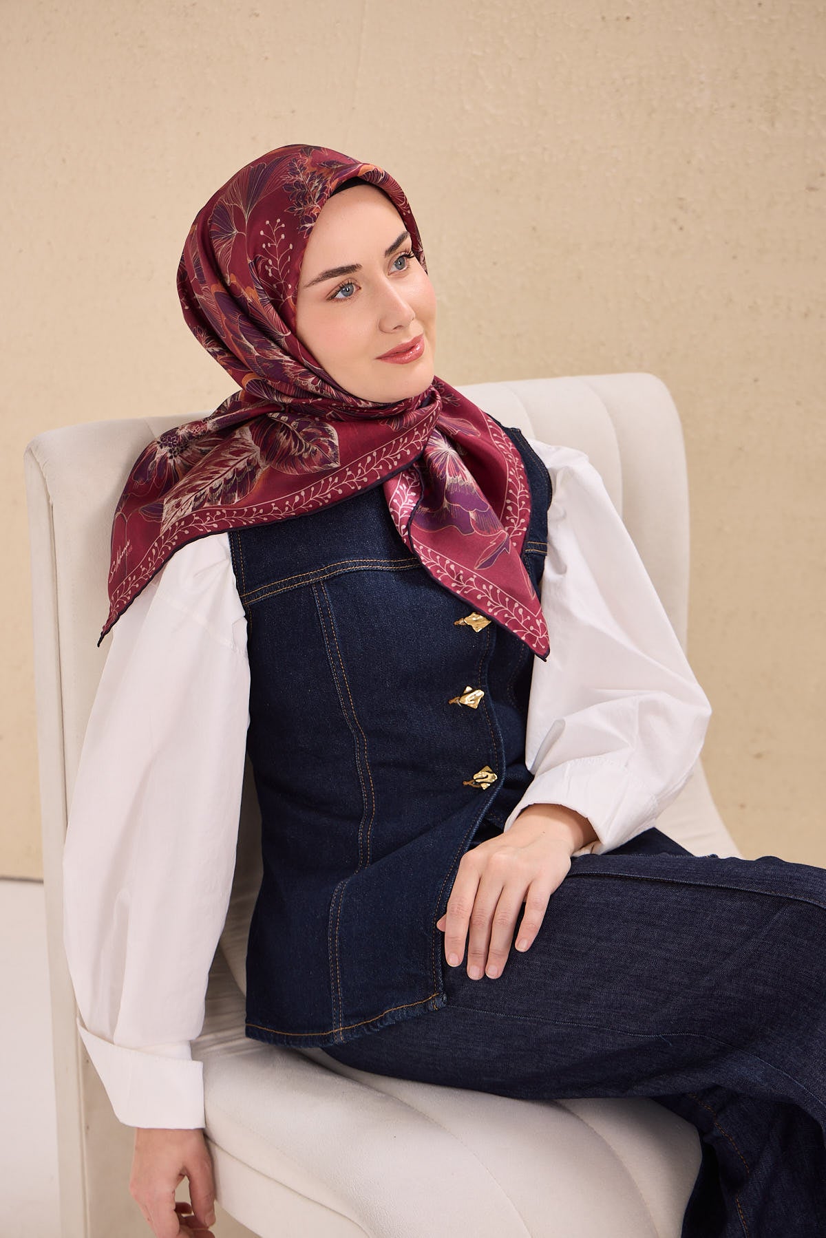 Twill İpek Eşarp Büyük Çiçek Vişne Çürüğü 90x90