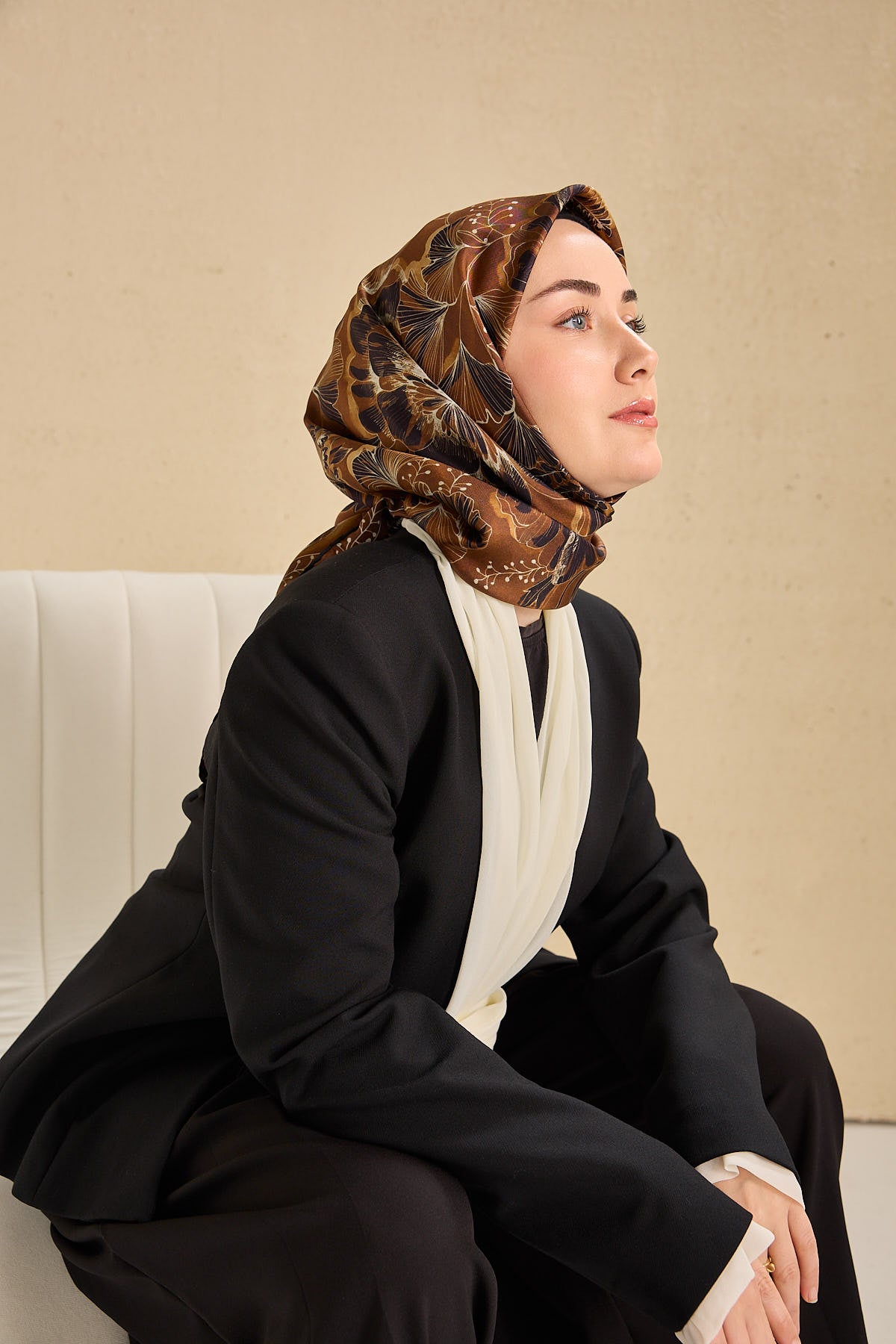 Kahverengi, siyah, beyaz, hardal tonlarının doğal uyumunu yansıtan bu twill ipek eşarp, tok duruşlu yapısıyla gün boyu formunu korumak isteyen kullanıcılar için ideal bir seçimdir. Twill dokumasının sunduğu kaymaz kumaş özelliği, eşarbın başta kolay şekil almasını sağlar ve gün içinde kayma hissini en aza indirir.