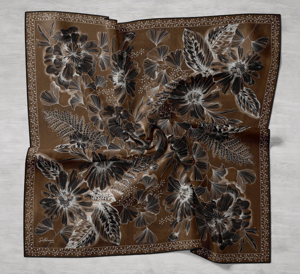 Twill İpek Eşarp Büyük Çiçek Kahverengi 90x90
