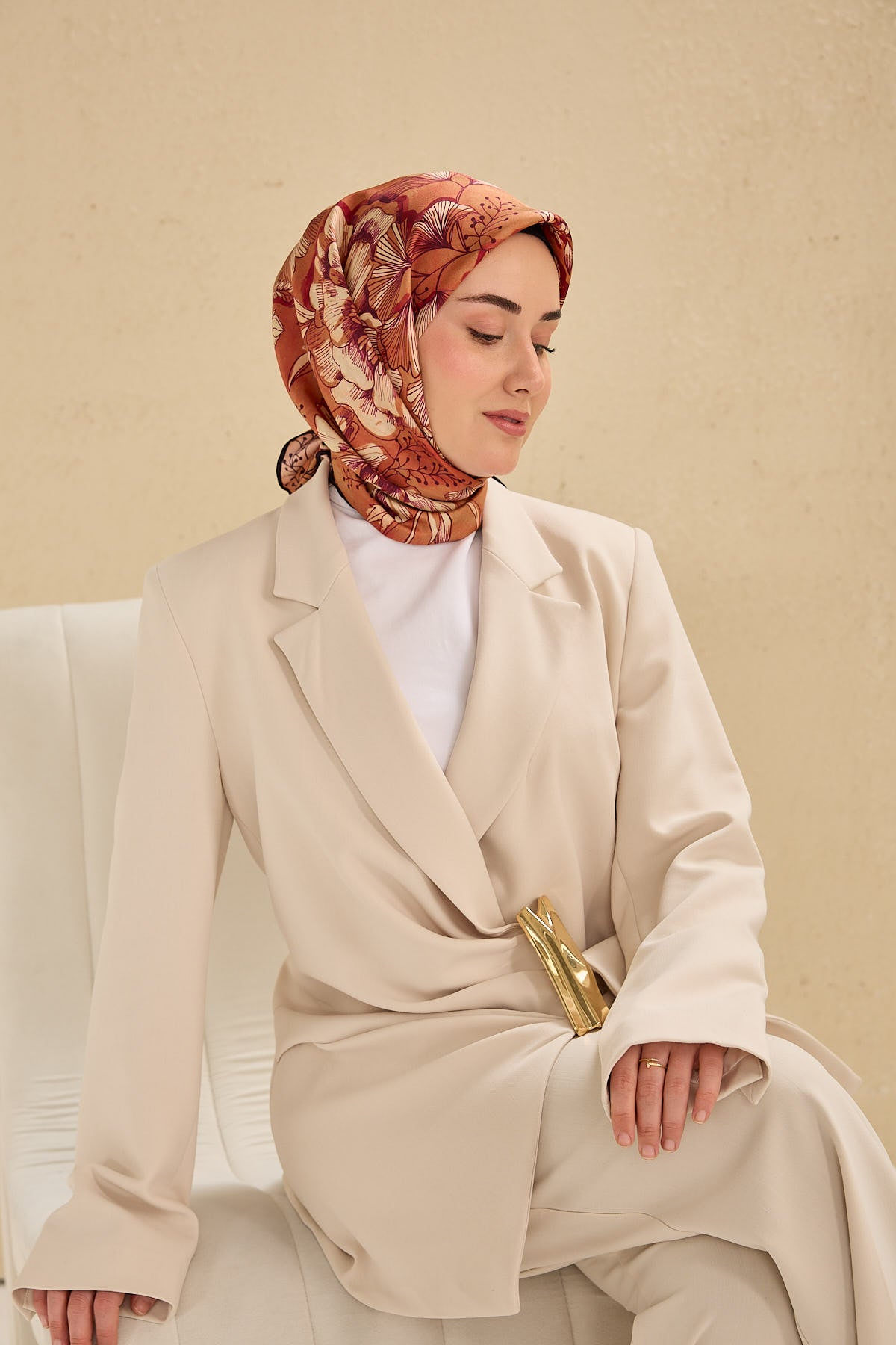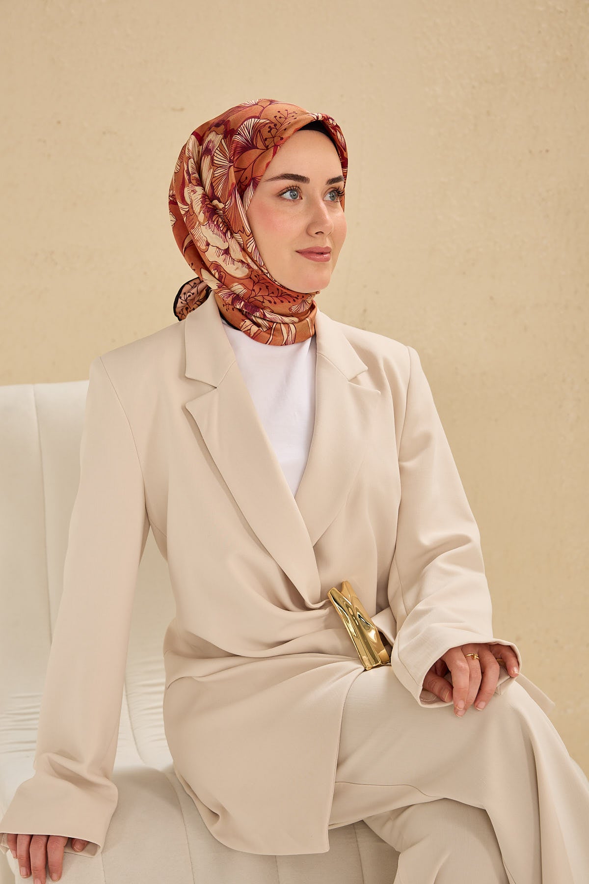 Somon, krem, bordo onlarının doğal uyumunu yansıtan bu twill ipek eşarp, tok duruşlu yapısıyla gün boyu formunu korumak isteyen kullanıcılar için ideal bir seçimdir. Twill dokumasının sunduğu kaymaz kumaş özelliği, eşarbın başta kolay şekil almasını sağlar ve gün içinde kayma hissini en aza indirir.