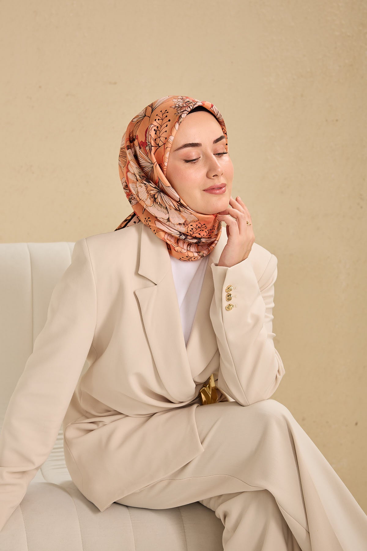 Yavruağzı, kırmızı, krem, siyah onlarının doğal uyumunu yansıtan bu twill ipek eşarp, tok duruşlu yapısıyla gün boyu formunu korumak isteyen kullanıcılar için ideal bir seçimdir. Twill dokumasının sunduğu kaymaz kumaş özelliği, eşarbın başta kolay şekil almasını sağlar ve gün içinde kayma hissini en aza indirir.