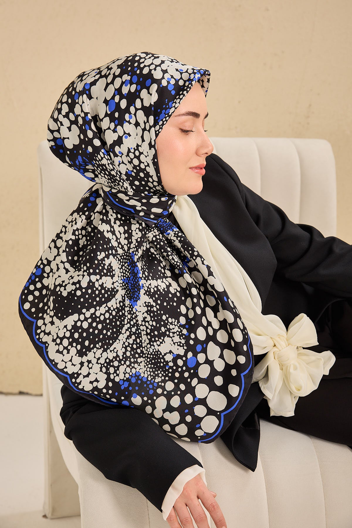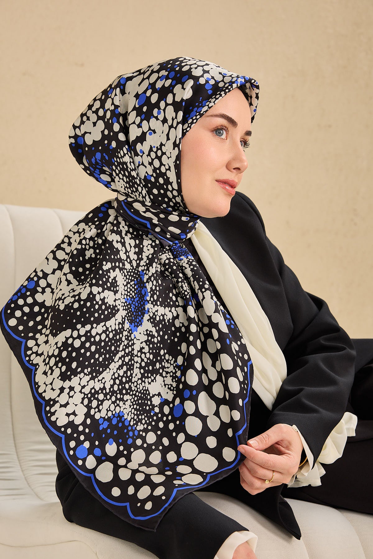 Siyah, beyaz, mavi tonlarının doğal uyumunu yansıtan bu twill ipek eşarp, tok duruşlu yapısıyla gün boyu formunu korumak isteyen kullanıcılar için ideal bir seçimdir. Twill dokumasının sunduğu kaymaz kumaş özelliği, eşarbın başta kolay şekil almasını sağlar ve gün içinde kayma hissini en aza indirir.