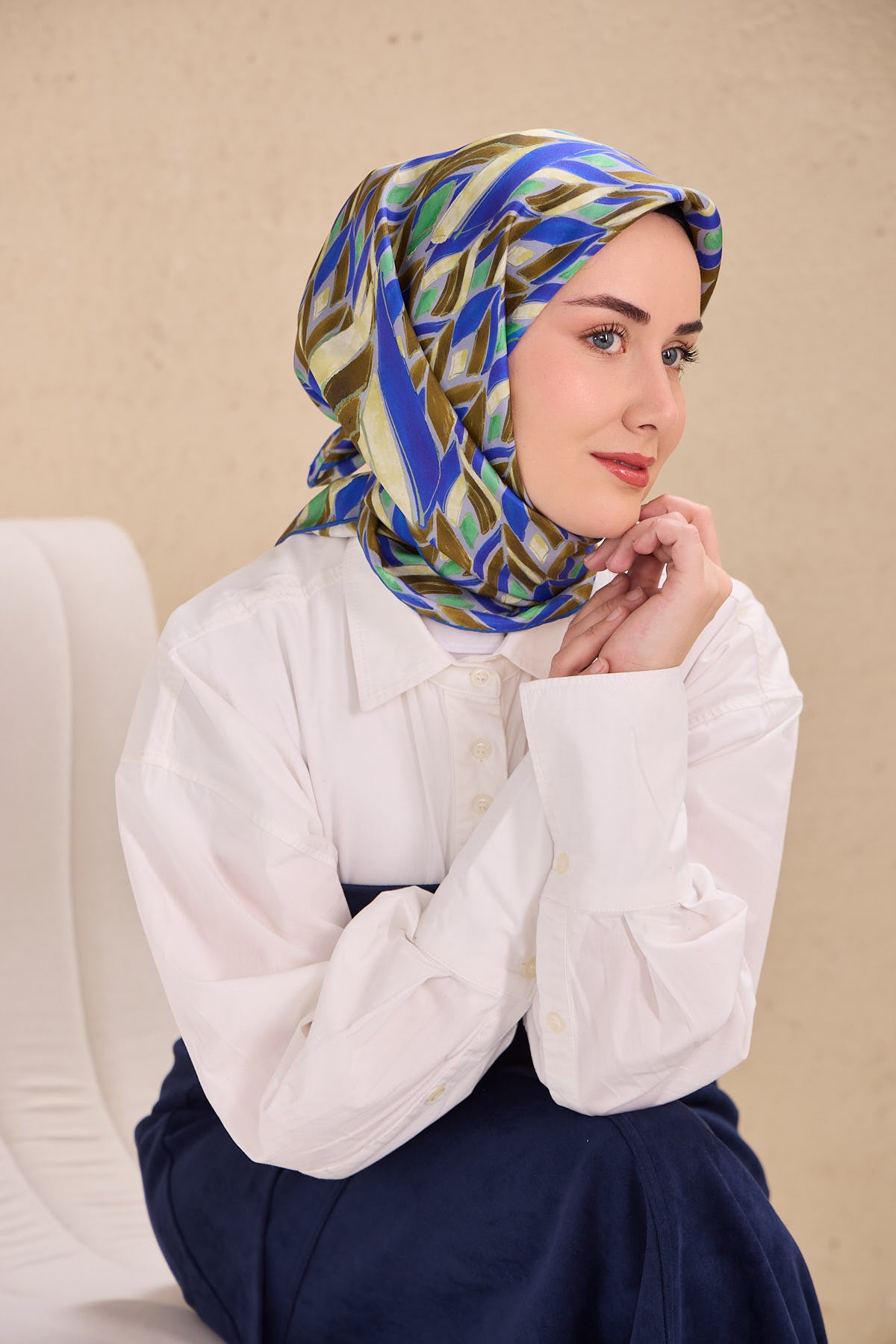 Saks, yağ yeşili, yeşil, pastel sarı tonlarının doğal uyumunu yansıtan bu twill ipek eşarp, tok duruşlu yapısıyla gün boyu formunu korumak isteyen kullanıcılar için ideal bir seçimdir. Twill dokumasının sunduğu kaymaz kumaş özelliği, eşarbın başta kolay şekil almasını sağlar ve gün içinde kayma hissini en aza indirir.