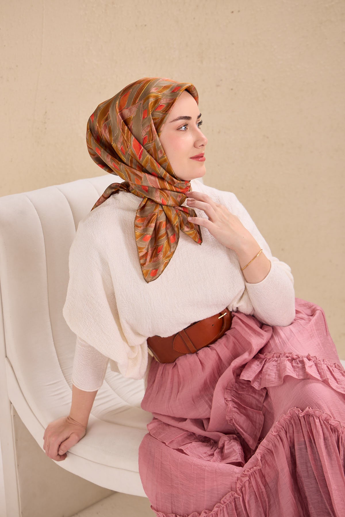 Yeşil gri, yağ yeşili, narçiçeği tonlarının doğal uyumunu yansıtan bu twill ipek eşarp, tok duruşlu yapısıyla gün boyu formunu korumak isteyen kullanıcılar için ideal bir seçimdir. Twill dokumasının sunduğu kaymaz kumaş özelliği, eşarbın başta kolay şekil almasını sağlar ve gün içinde kayma hissini en aza indirir.