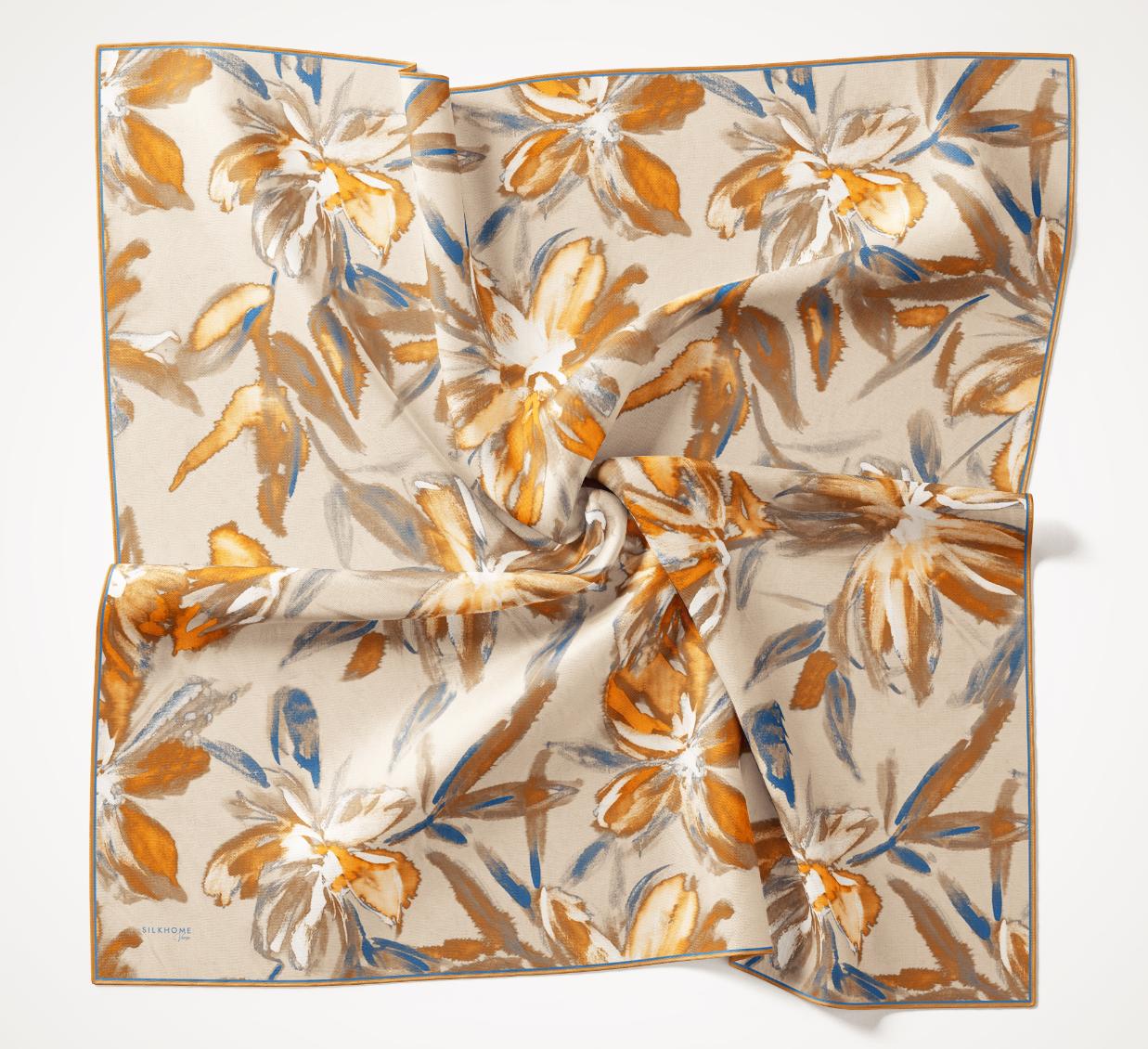 Bej, haki, mavi, turuncu tonlarının doğal uyumunu yansıtan bu twill ipek eşarp, tok duruşlu yapısıyla gün boyu formunu korumak isteyen kullanıcılar için ideal bir seçimdir. Twill dokumasının sunduğu kaymaz kumaş özelliği, eşarbın başta kolay şekil almasını sağlar ve gün içinde kayma hissini en aza indirir.
