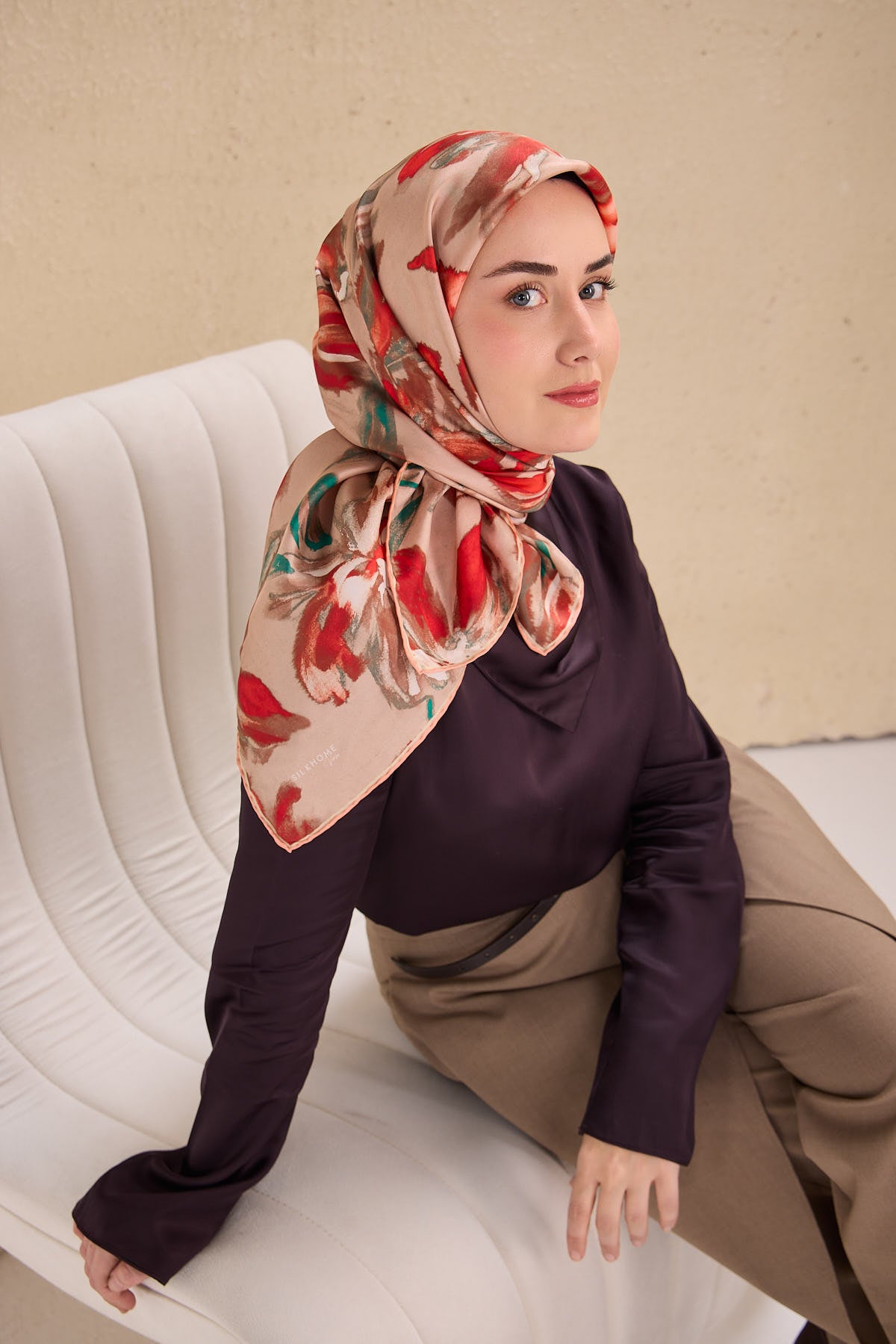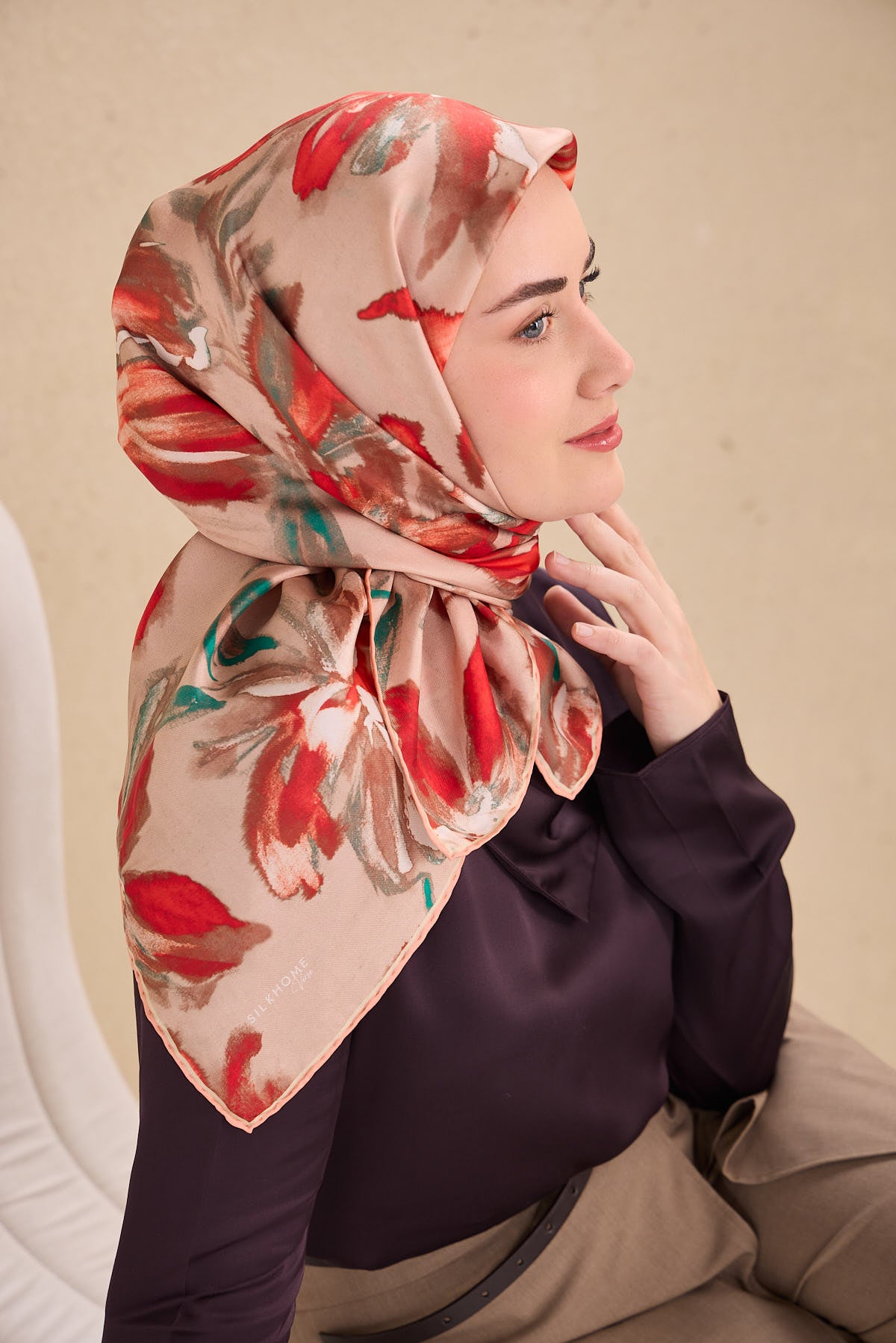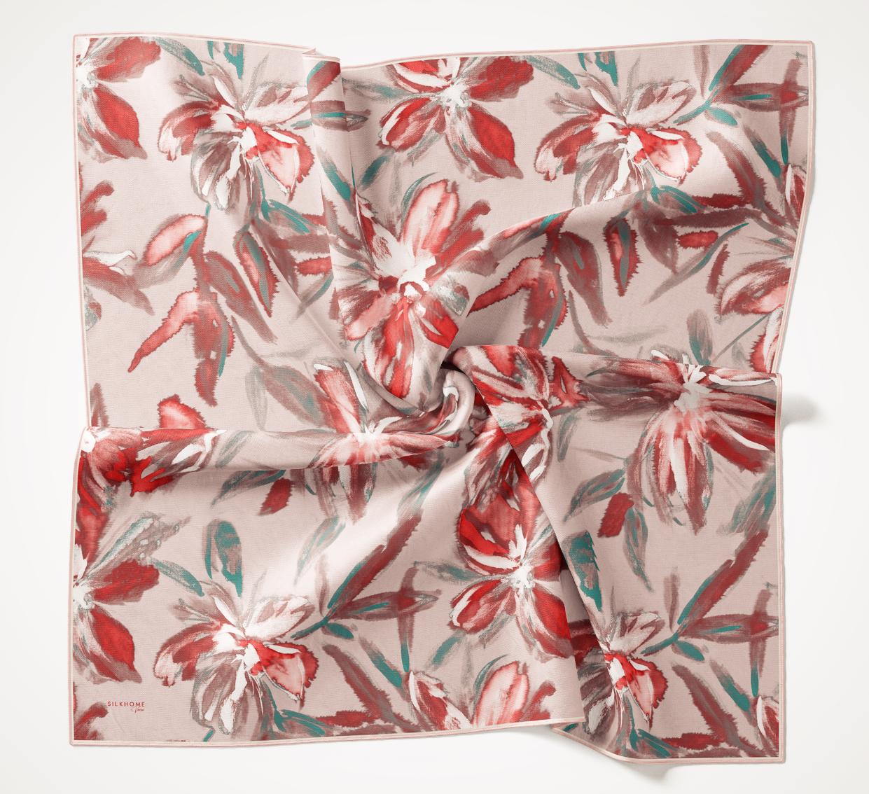 Pudra pembe, kırmızı, patina yeşil tonlarının doğal uyumunu yansıtan bu twill ipek eşarp, tok duruşlu yapısıyla gün boyu formunu korumak isteyen kullanıcılar için ideal bir seçimdir. Twill dokumasının sunduğu kaymaz kumaş özelliği, eşarbın başta kolay şekil almasını sağlar ve gün içinde kayma hissini en aza indirir.