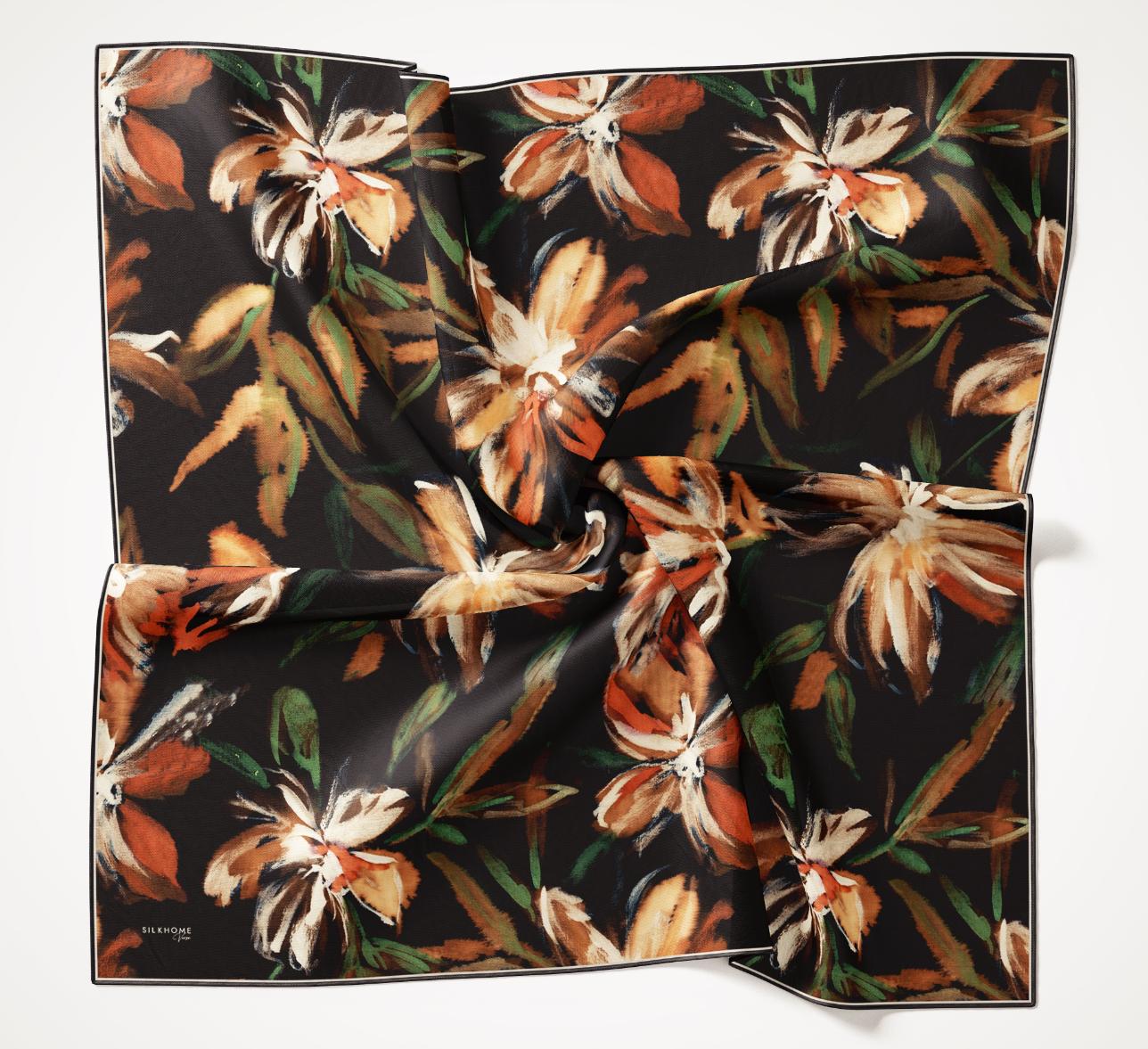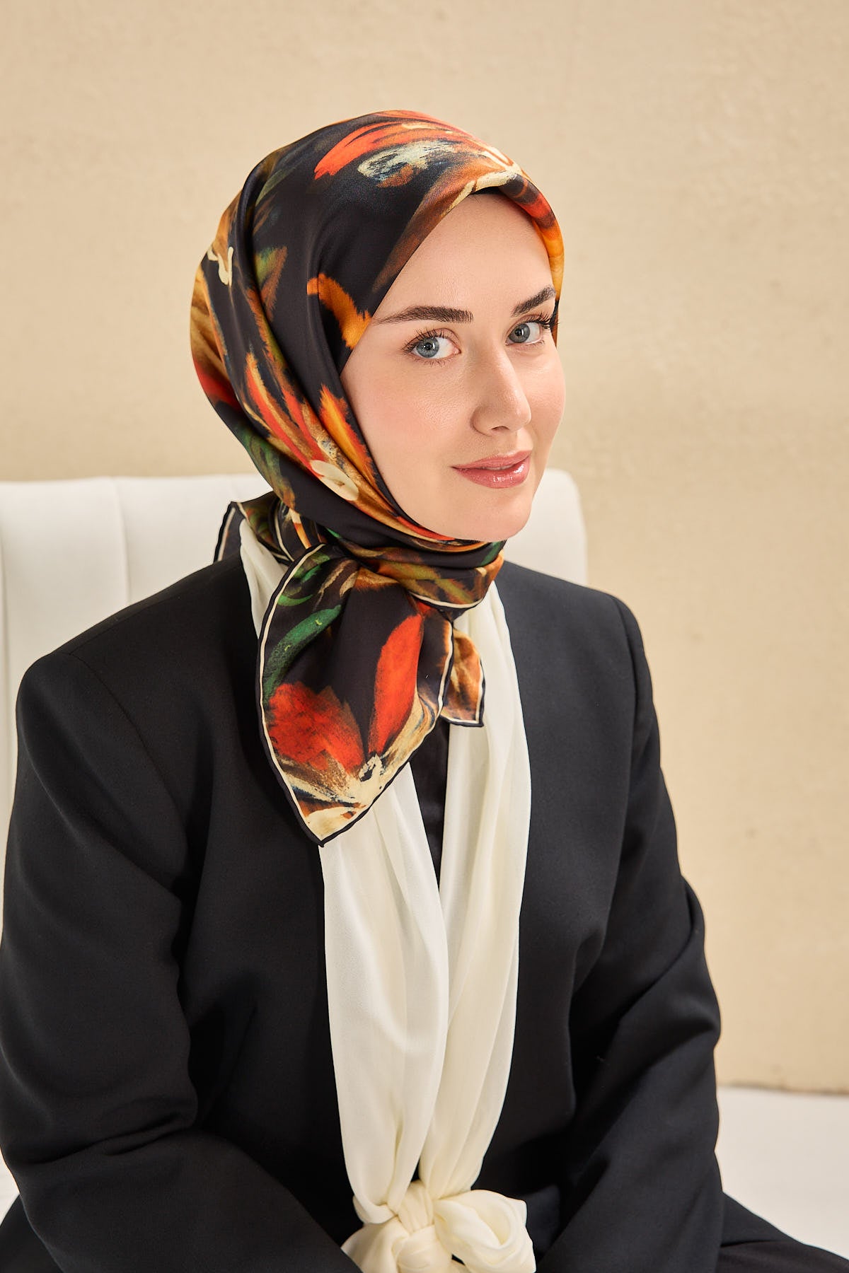 siyah, turuncu, yeşil, krem tonlarının doğal uyumunu yansıtan bu twill ipek eşarp, tok duruşlu yapısıyla gün boyu formunu korumak isteyen kullanıcılar için ideal bir seçimdir. Twill dokumasının sunduğu kaymaz kumaş özelliği, eşarbın başta kolay şekil almasını sağlar ve gün içinde kayma hissini en aza indirir.