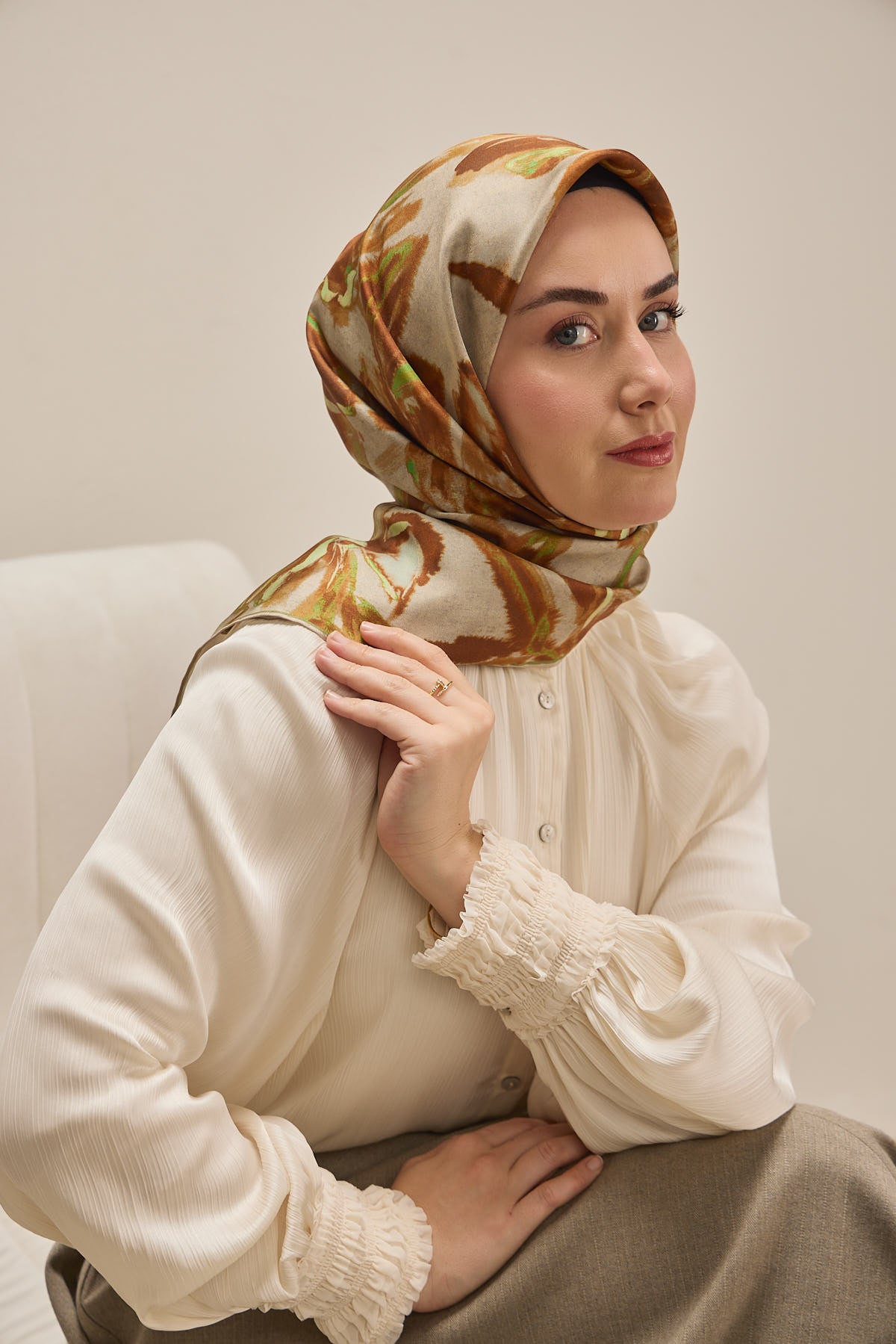 Taba, gümüş, yeşil tonlarının doğal uyumunu yansıtan bu twill ipek eşarp, tok duruşlu yapısıyla gün boyu formunu korumak isteyen kullanıcılar için ideal bir seçimdir. Twill dokumasının sunduğu kaymaz kumaş özelliği, eşarbın başta kolay şekil almasını sağlar ve gün içinde kayma hissini en aza indirir.