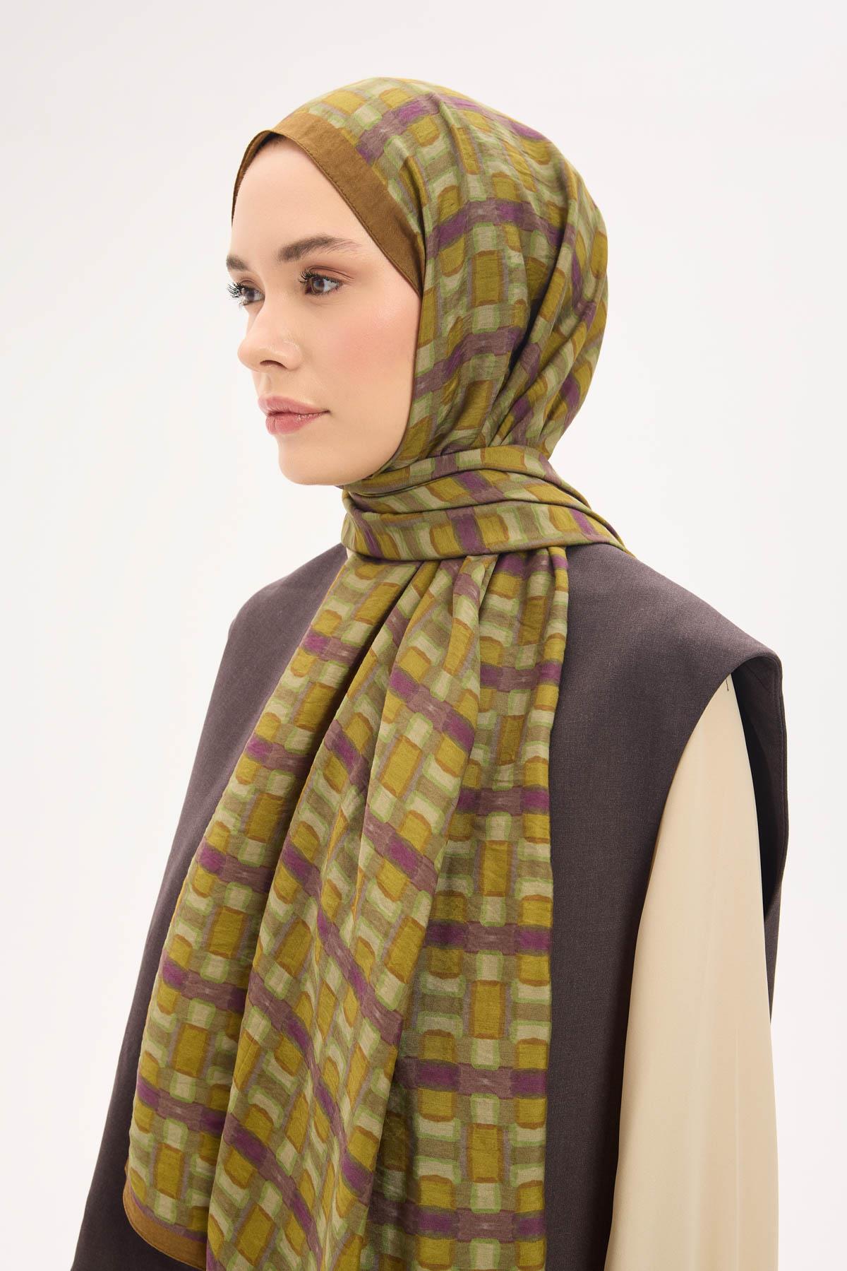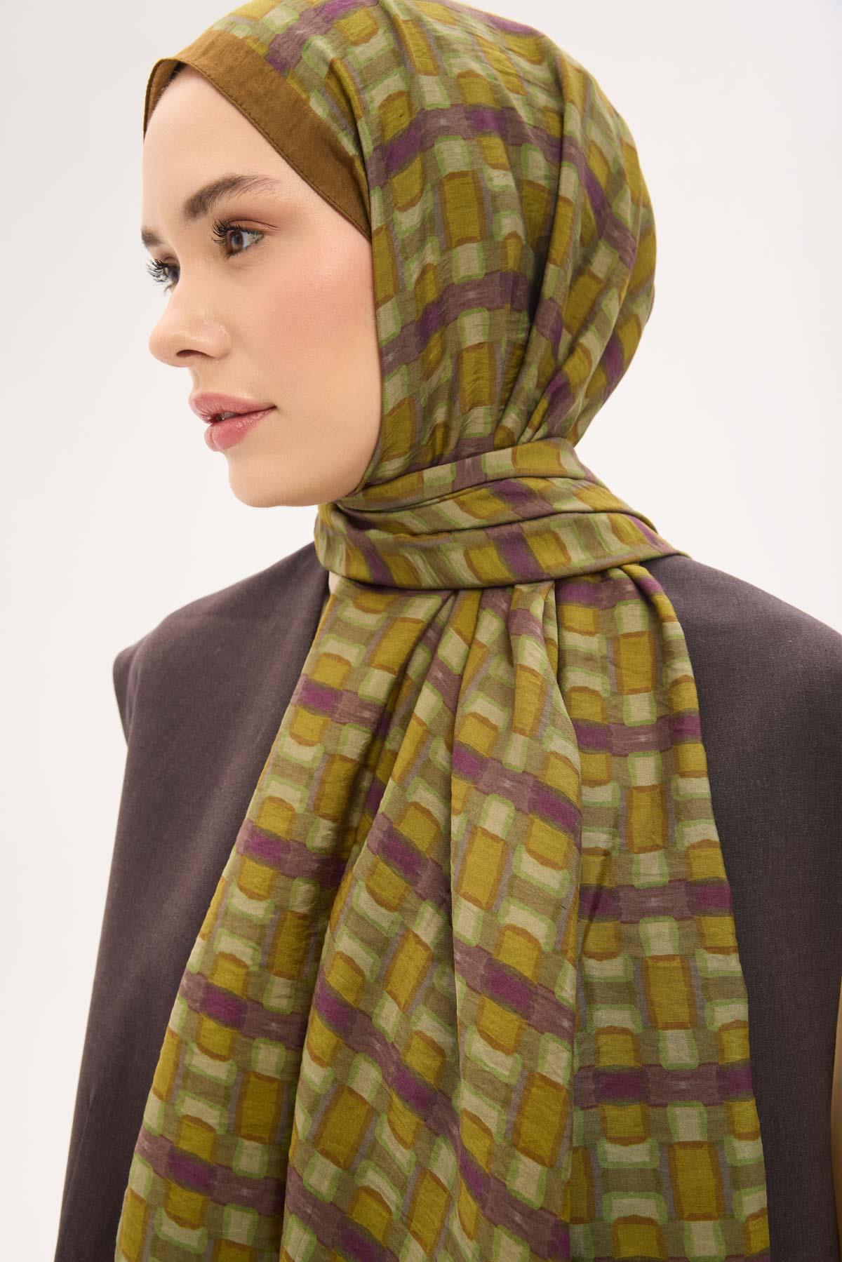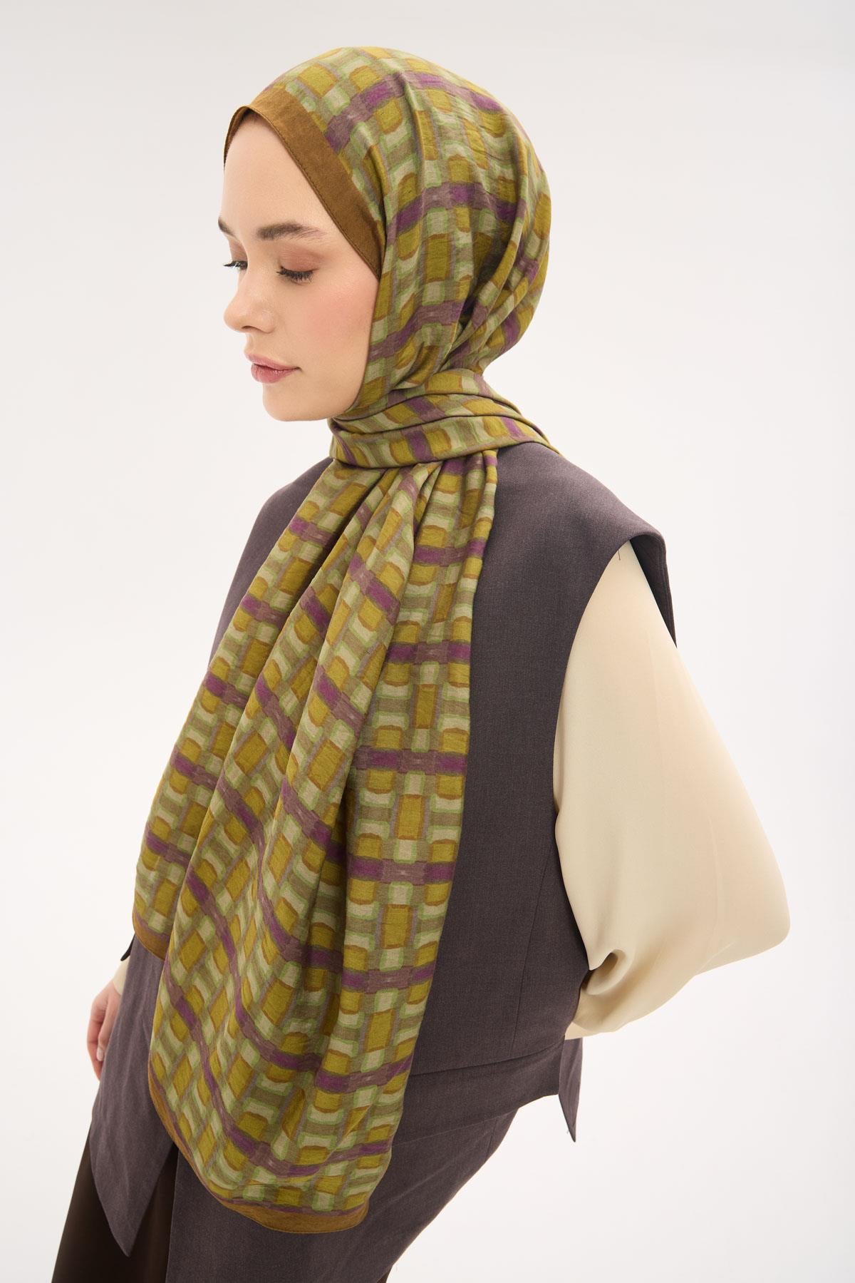 Haki zemin üzerinde blok desen detaylarıyla tasarlanan mayda şal, ince dokulu ve hafif yapısıyla gün boyu konforlu bir kullanım sunar. Doğal lif iplikleri içeren kumaşı sayesinde nefes alabilir yapıdadır ve ciltle temas ettiğinde rahatsızlık hissi oluşturmaz. Dökümlü formu, şalın omuzda ve boyunda dengeli bir duruş sergilemesini sağlar.