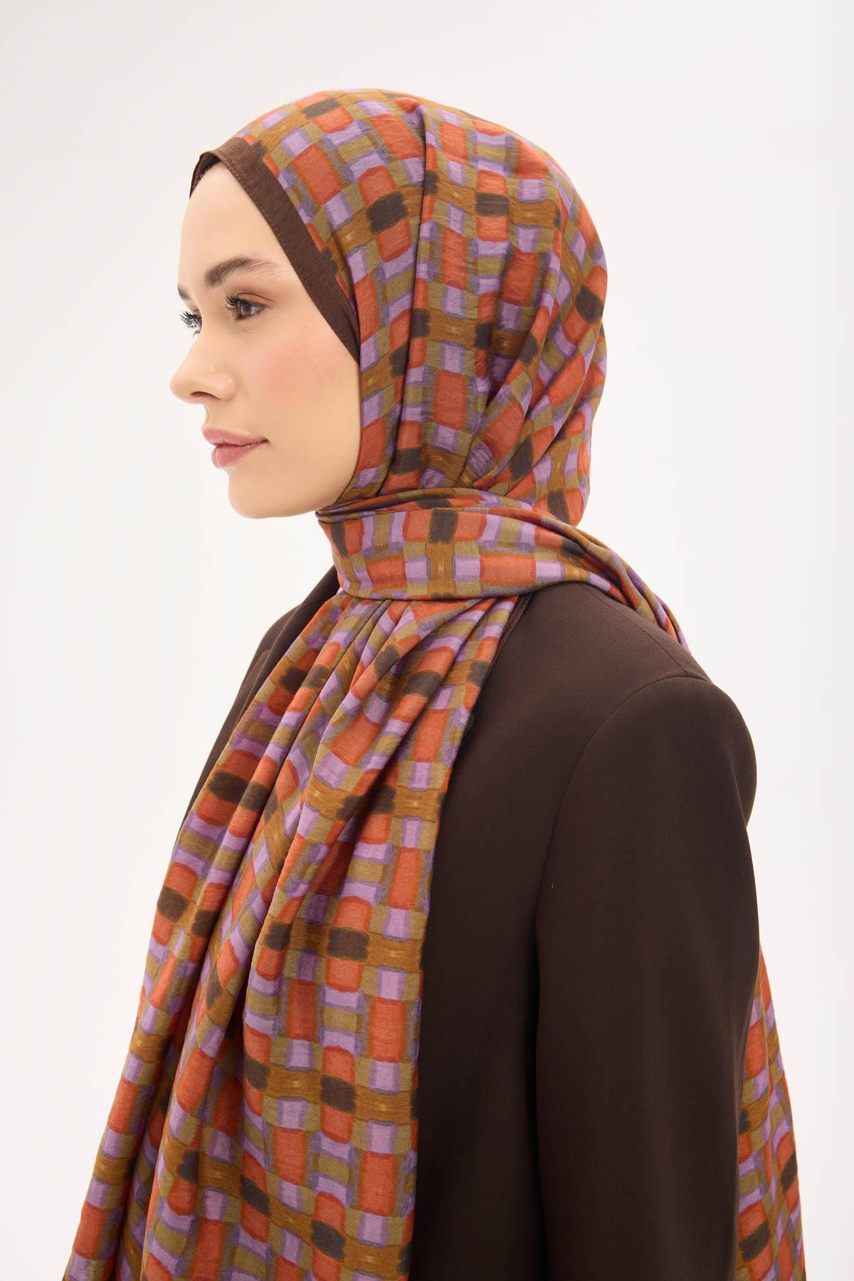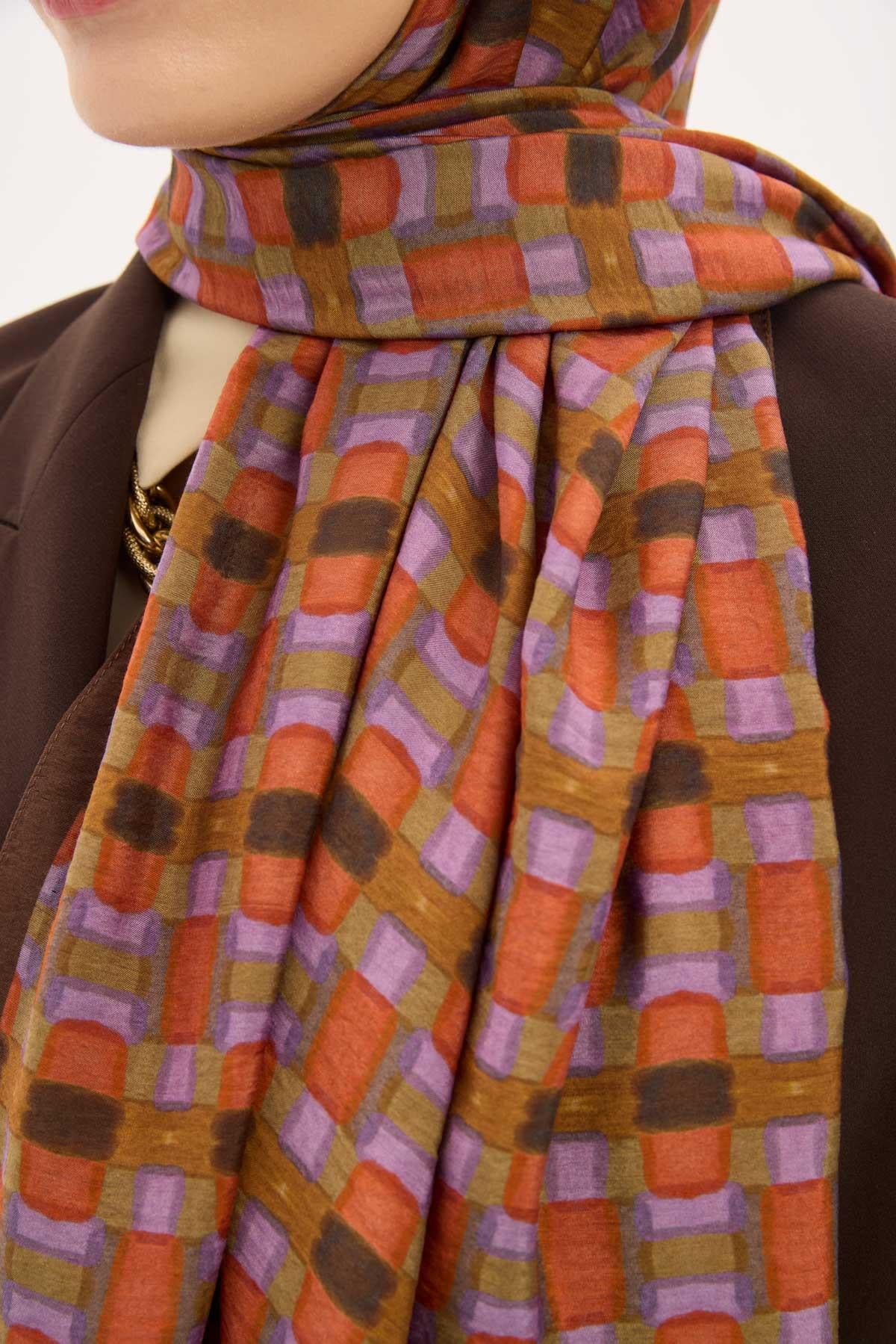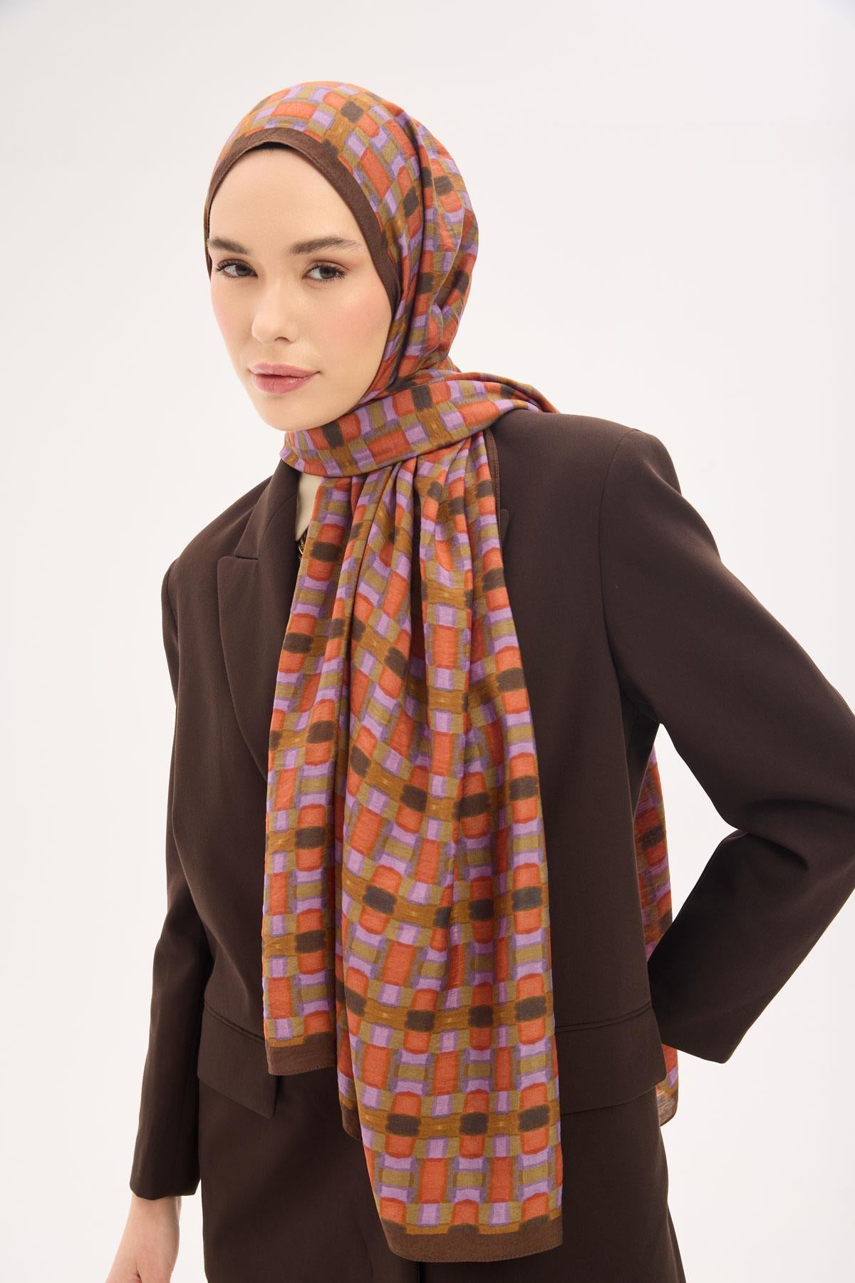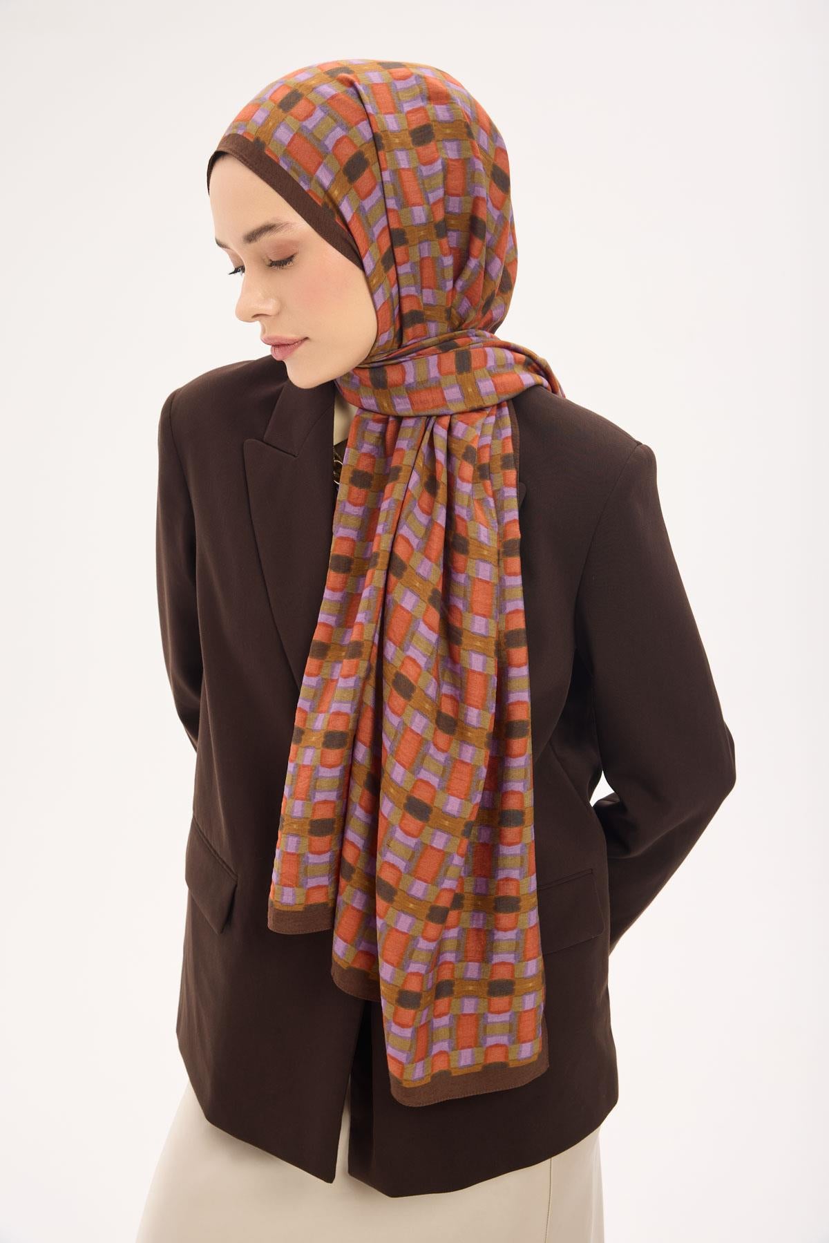 Kahverengi zemin üzerinde blok desen detaylarıyla tasarlanan mayda şal, ince dokulu ve hafif yapısıyla gün boyu konforlu bir kullanım sunar. Doğal lif iplikleri içeren kumaşı sayesinde nefes alabilir yapıdadır ve ciltle temas ettiğinde rahatsızlık hissi oluşturmaz. Dökümlü formu, şalın omuzda ve boyunda dengeli bir duruş sergilemesini sağlar.