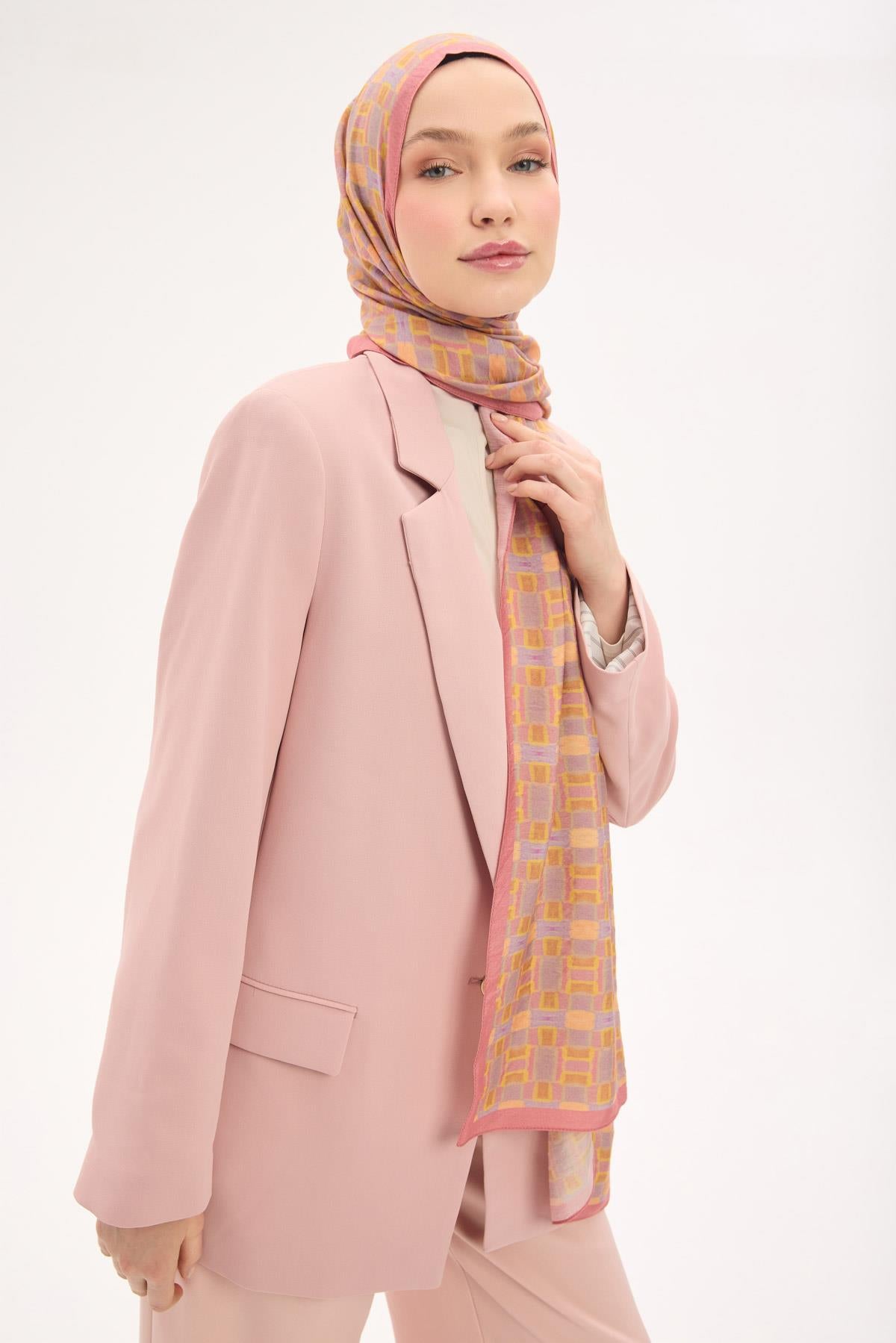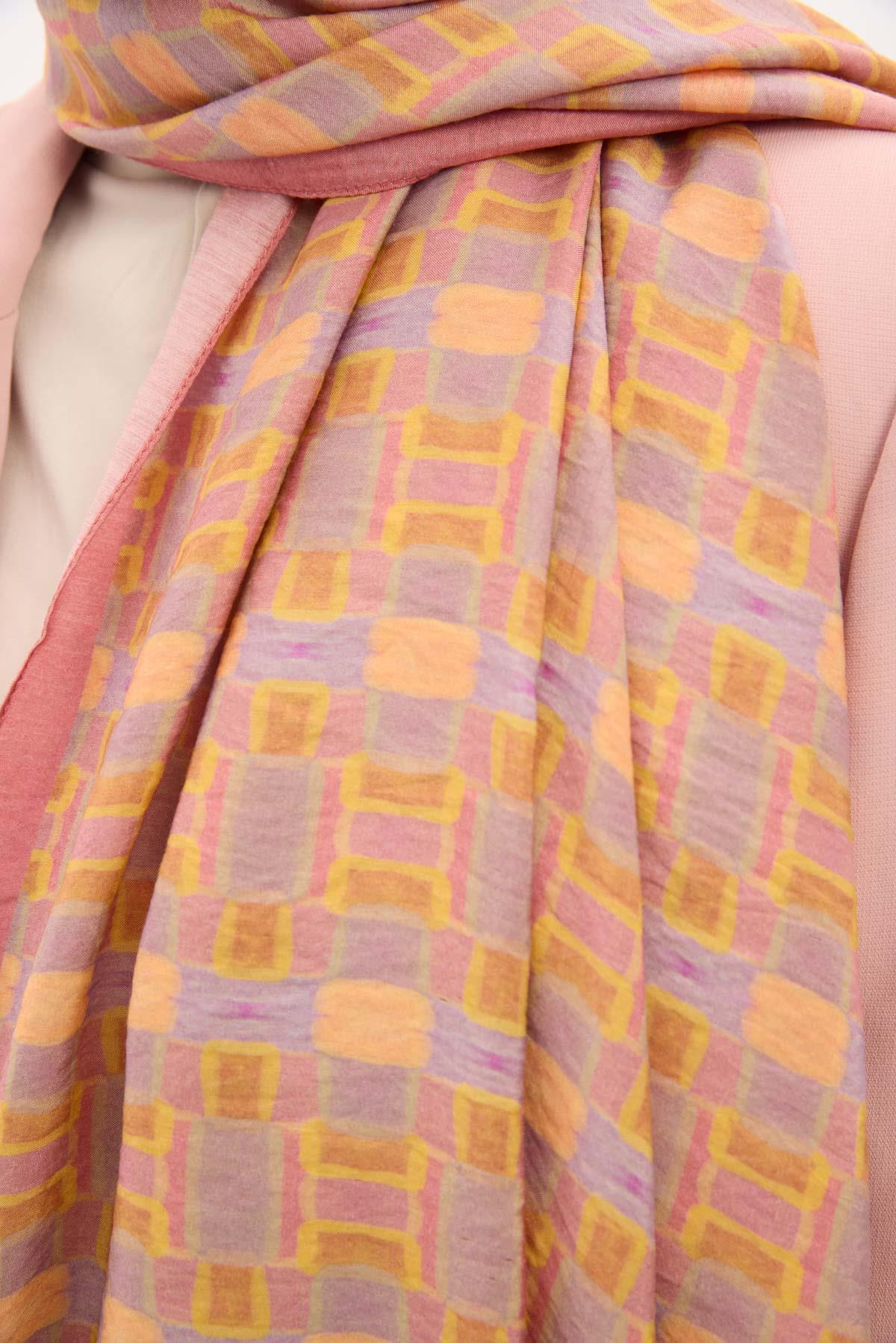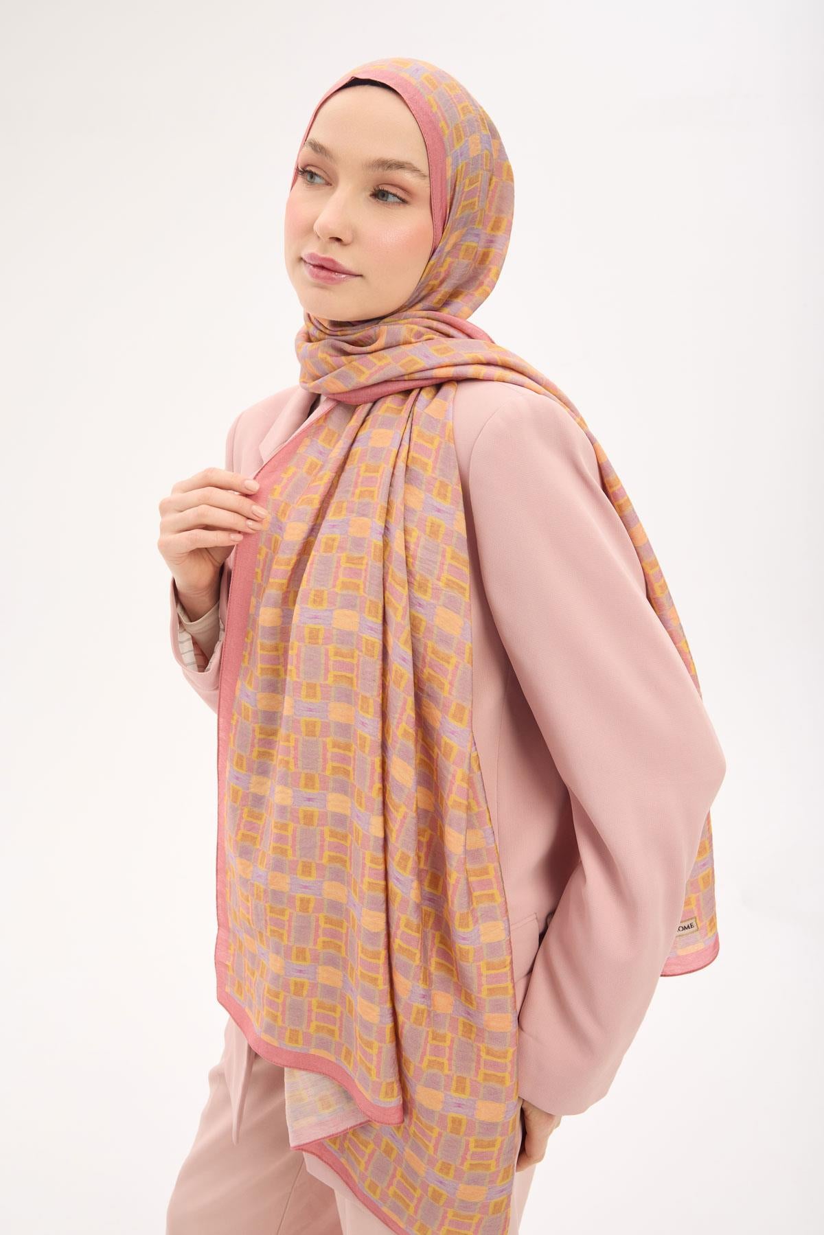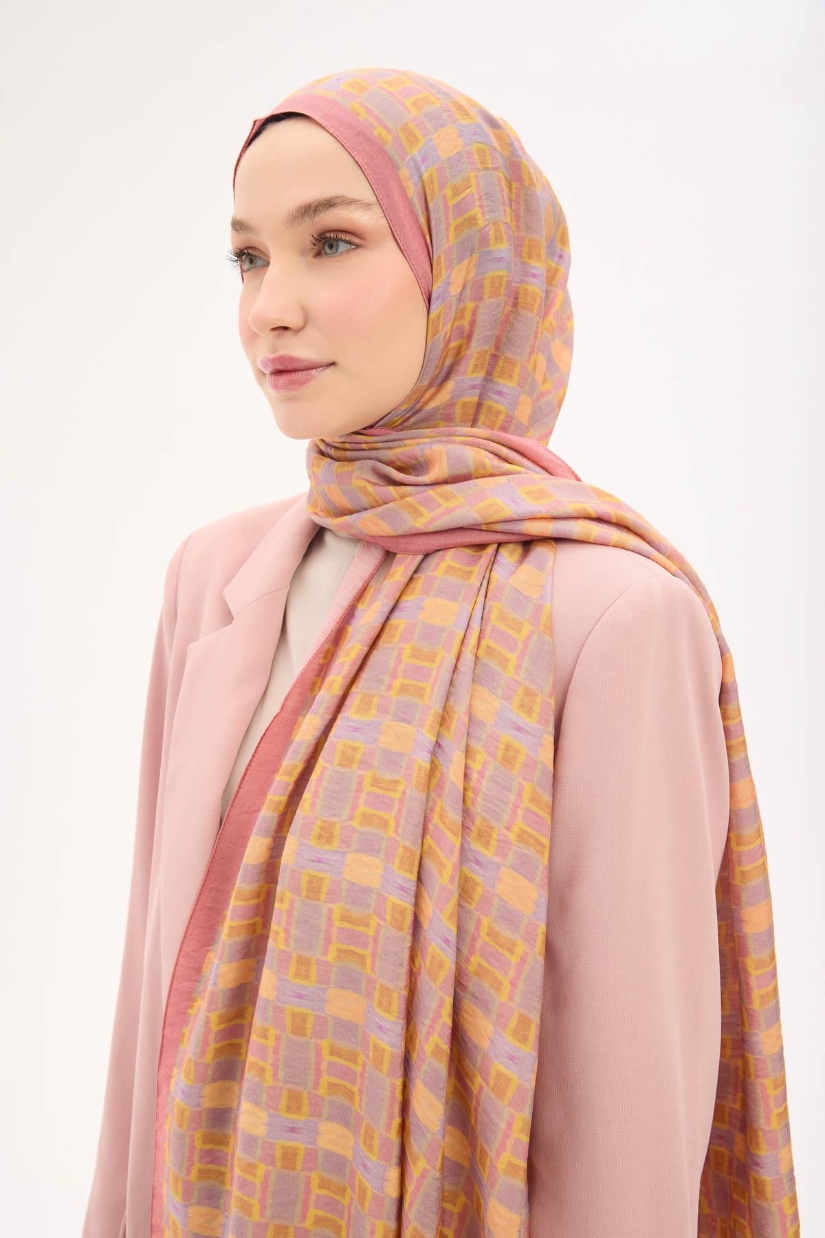 Tozpembe zemin üzerinde blok desen detaylarıyla tasarlanan mayda şal, ince dokulu ve hafif yapısıyla gün boyu konforlu bir kullanım sunar. Doğal lif iplikleri içeren kumaşı sayesinde nefes alabilir yapıdadır ve ciltle temas ettiğinde rahatsızlık hissi oluşturmaz. Dökümlü formu, şalın omuzda ve boyunda dengeli bir duruş sergilemesini sağlar.