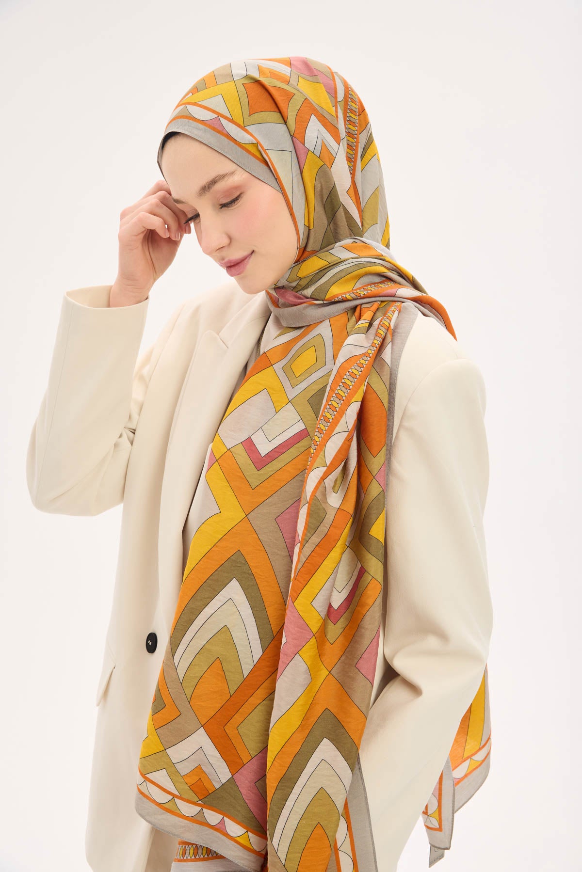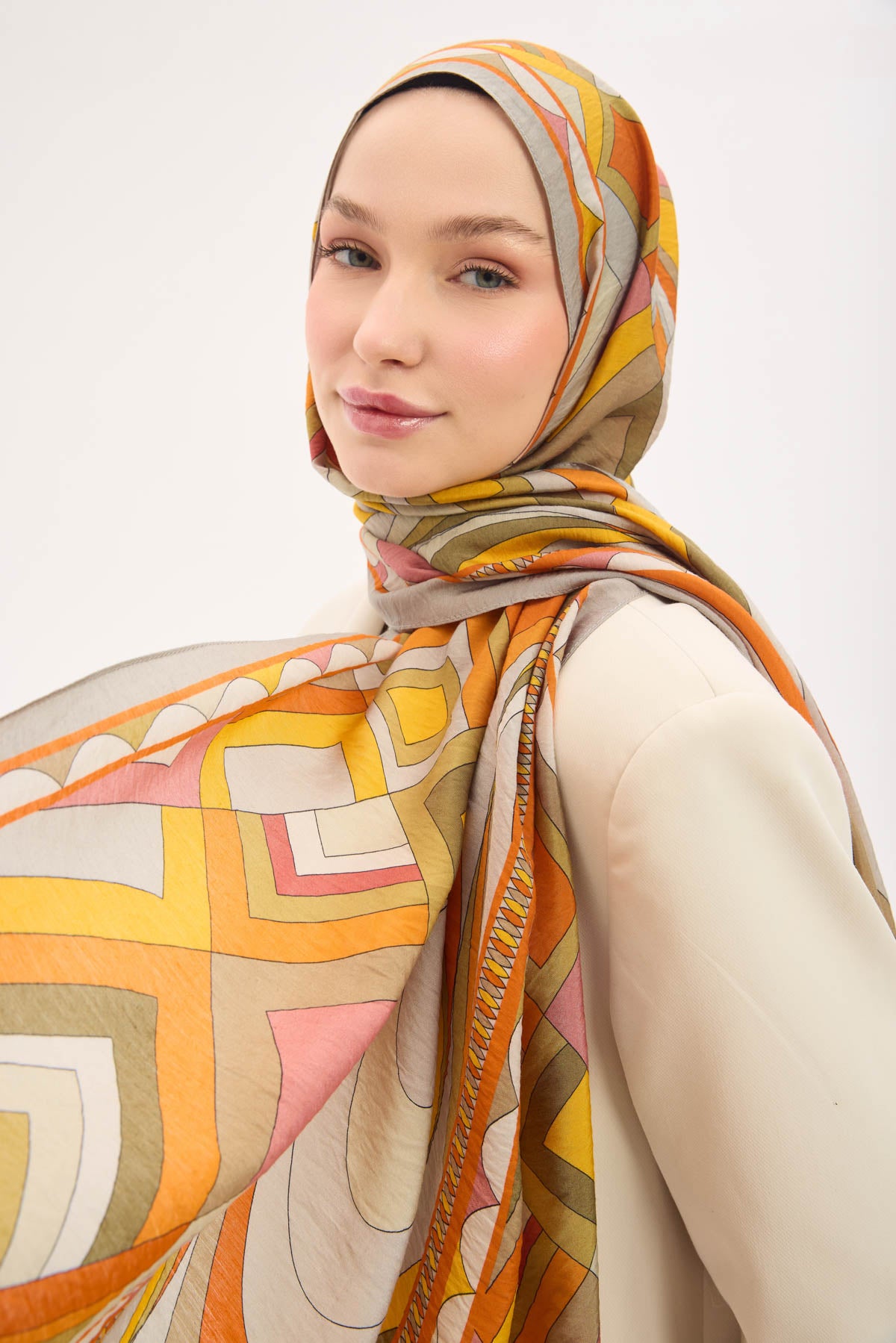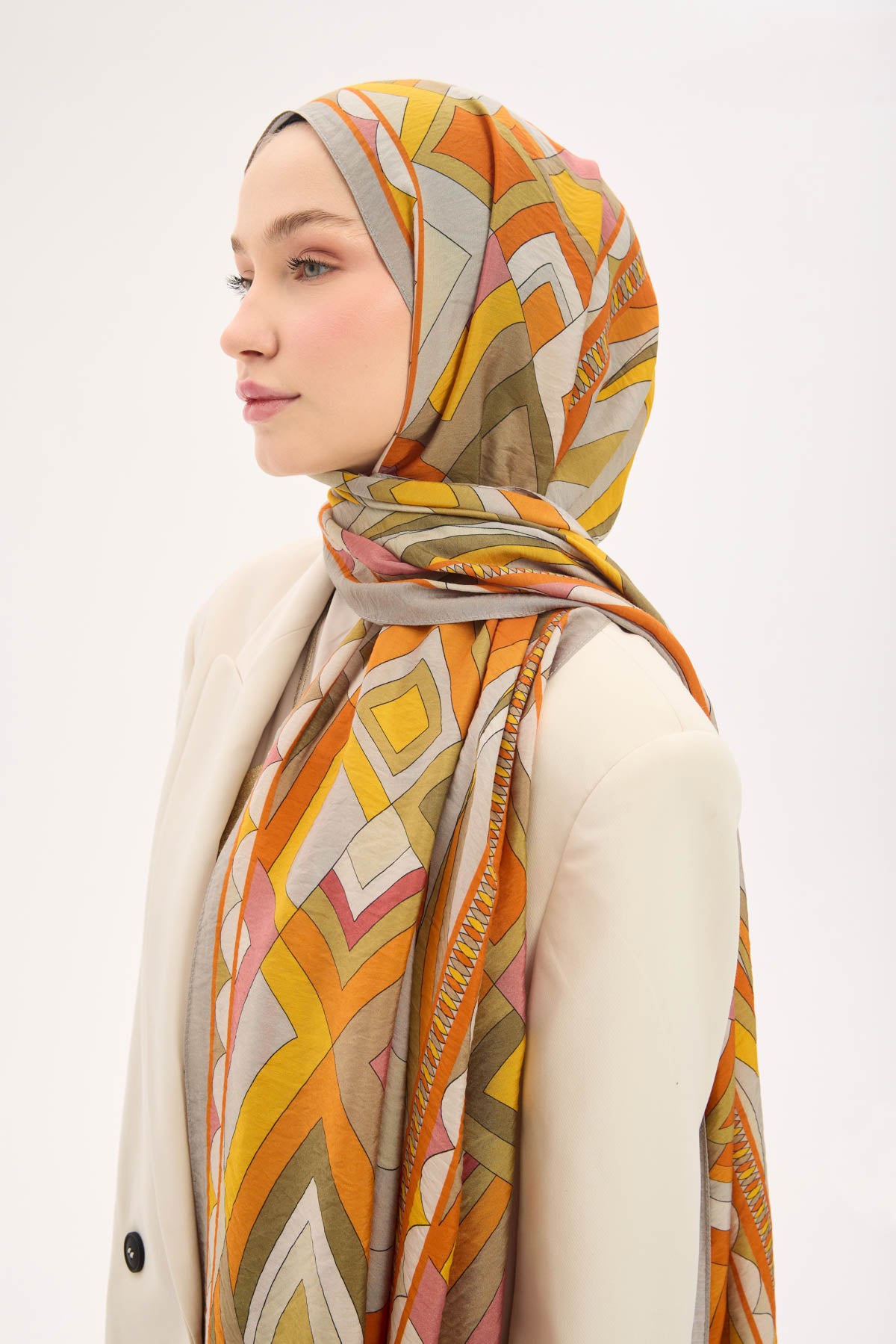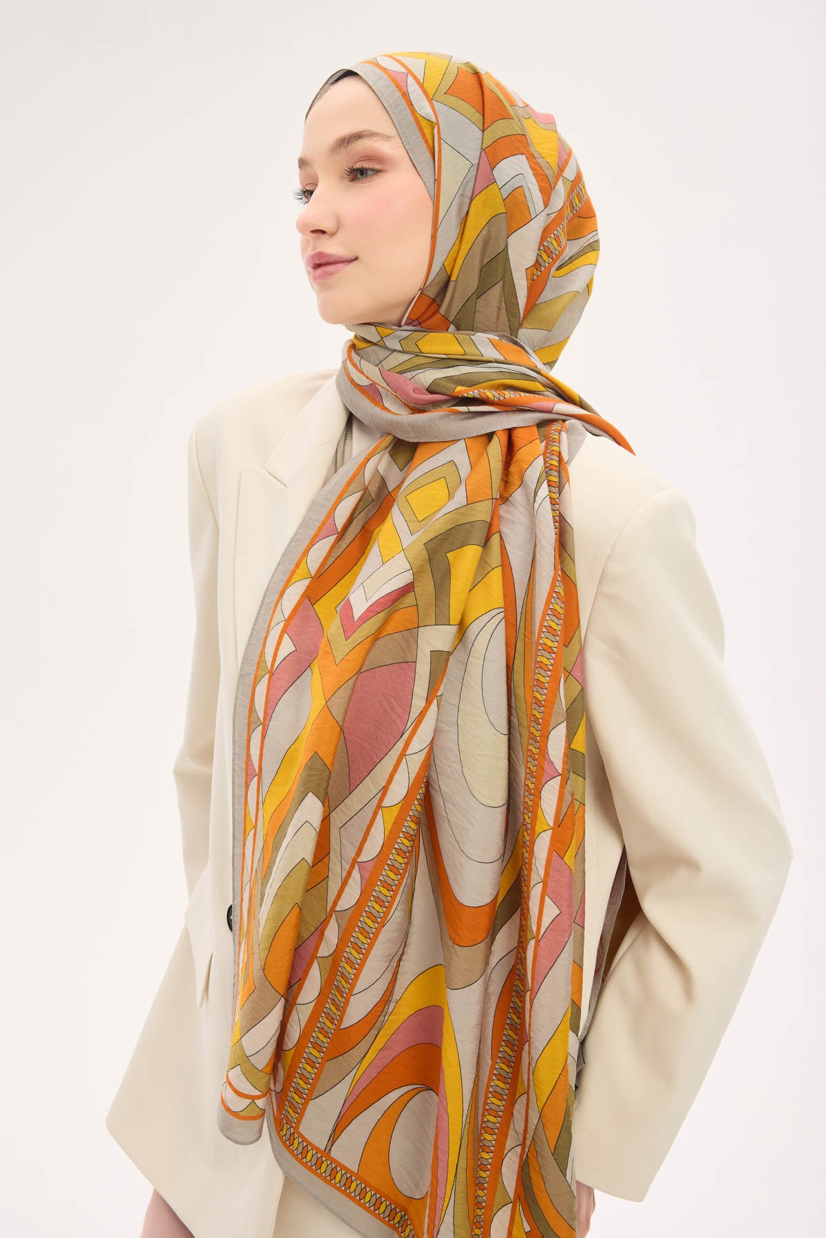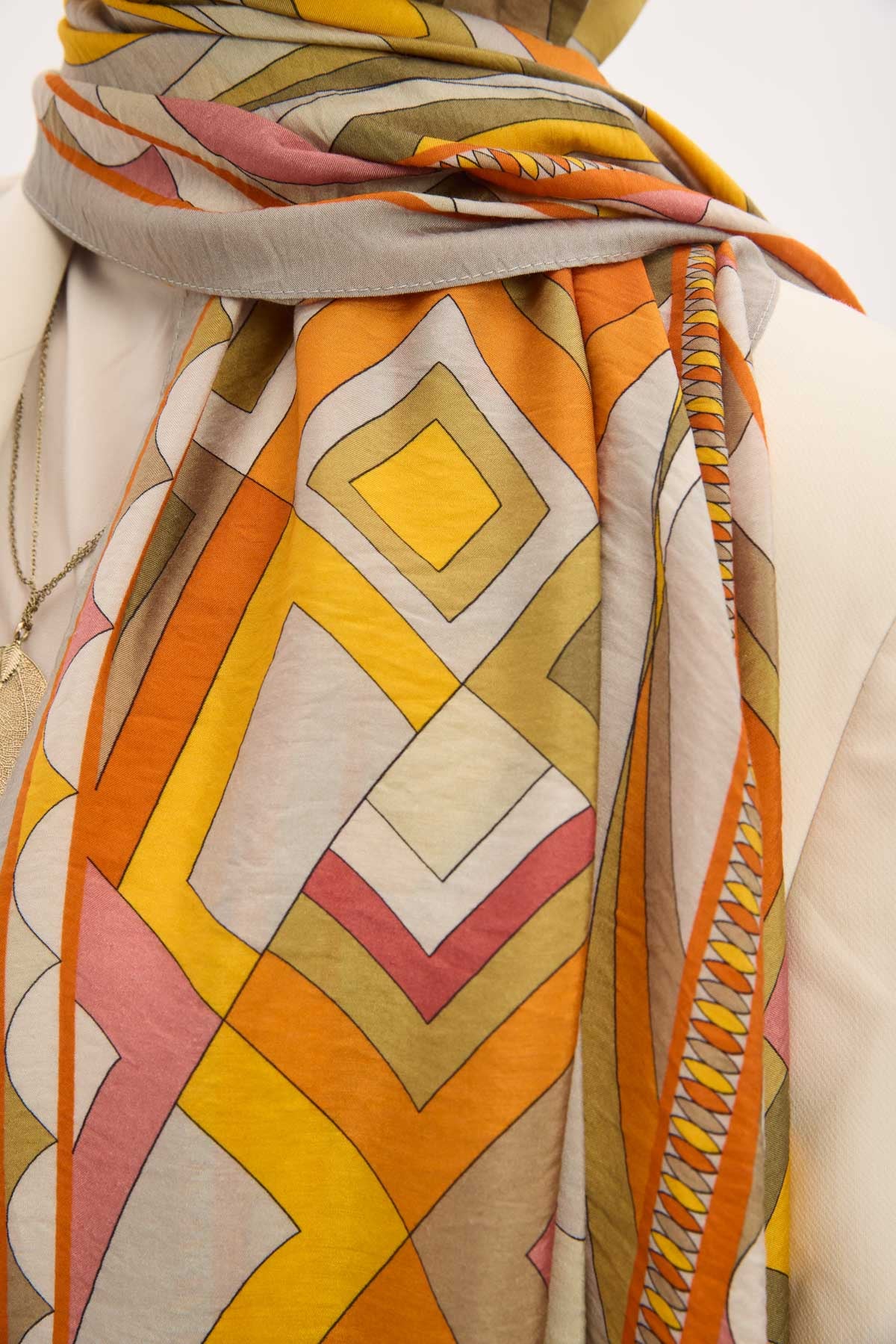Açık gri zemin üzerinde lora desen detaylarıyla tasarlanan mayda şal, ince dokulu ve hafif yapısıyla gün boyu konforlu bir kullanım sunar. Doğal lif iplikleri içeren kumaşı sayesinde nefes alabilir yapıdadır ve ciltle temas ettiğinde rahatsızlık hissi oluşturmaz. Dökümlü formu, şalın omuzda ve boyunda dengeli bir duruş sergilemesini sağlar.