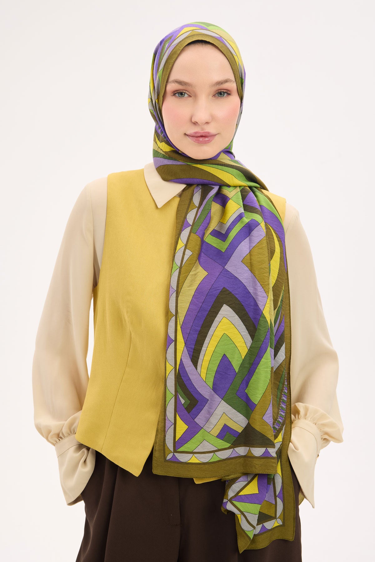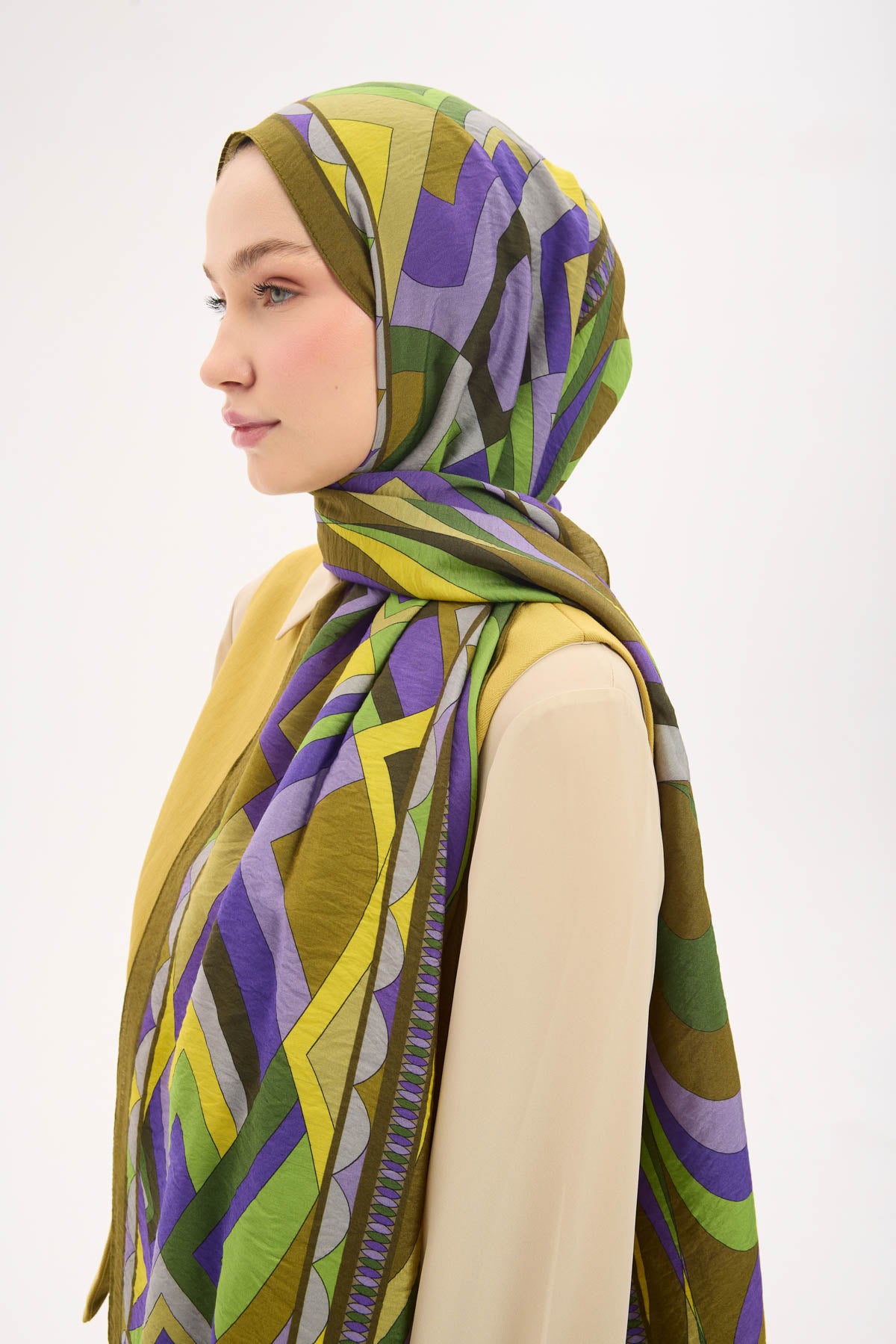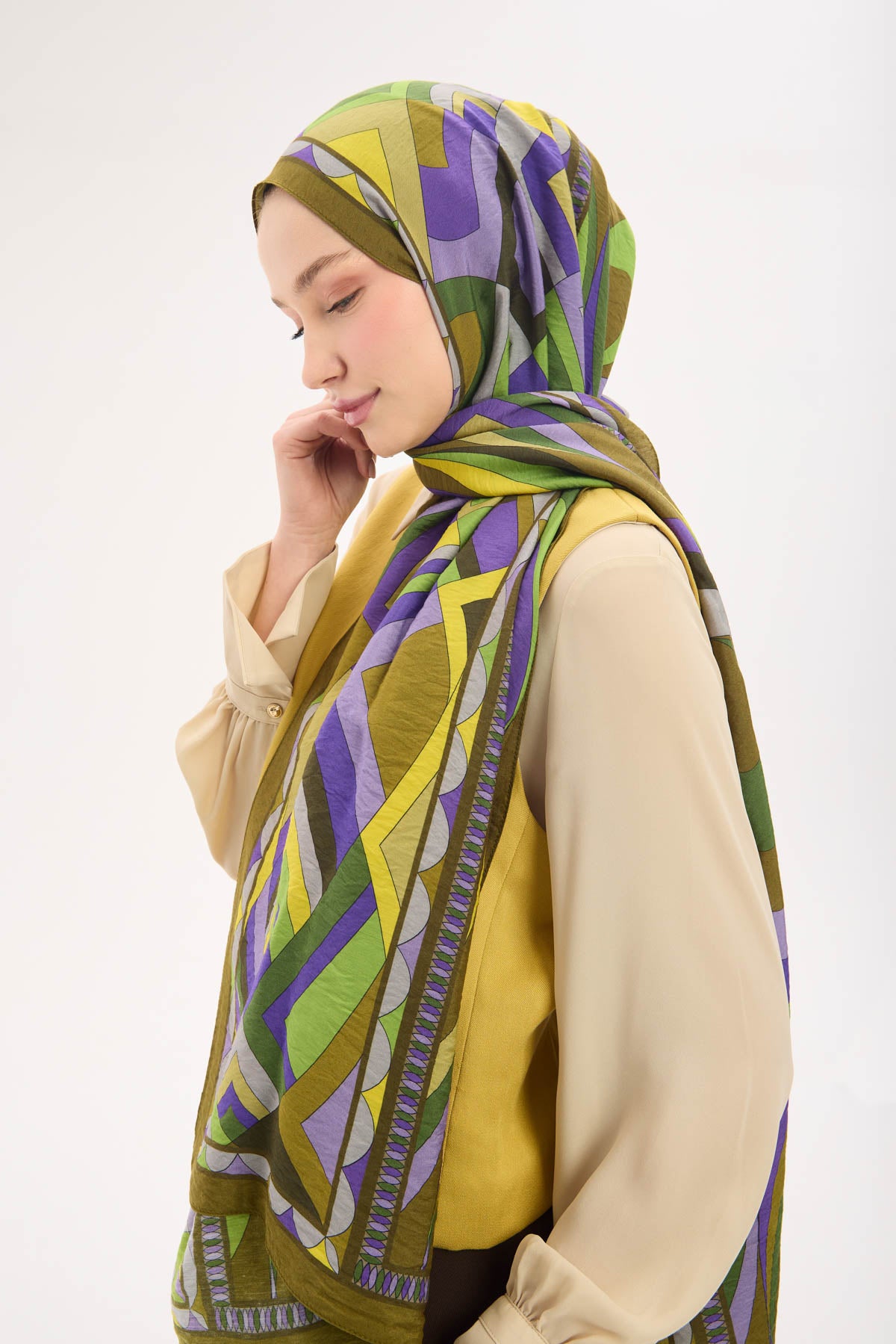 Koyu asker yeşili zemin üzerinde lora desen detaylarıyla tasarlanan mayda şal, ince dokulu ve hafif yapısıyla gün boyu konforlu bir kullanım sunar. Doğal lif iplikleri içeren kumaşı sayesinde nefes alabilir yapıdadır ve ciltle temas ettiğinde rahatsızlık hissi oluşturmaz. Dökümlü formu, şalın omuzda ve boyunda dengeli bir duruş sergilemesini sağlar.
