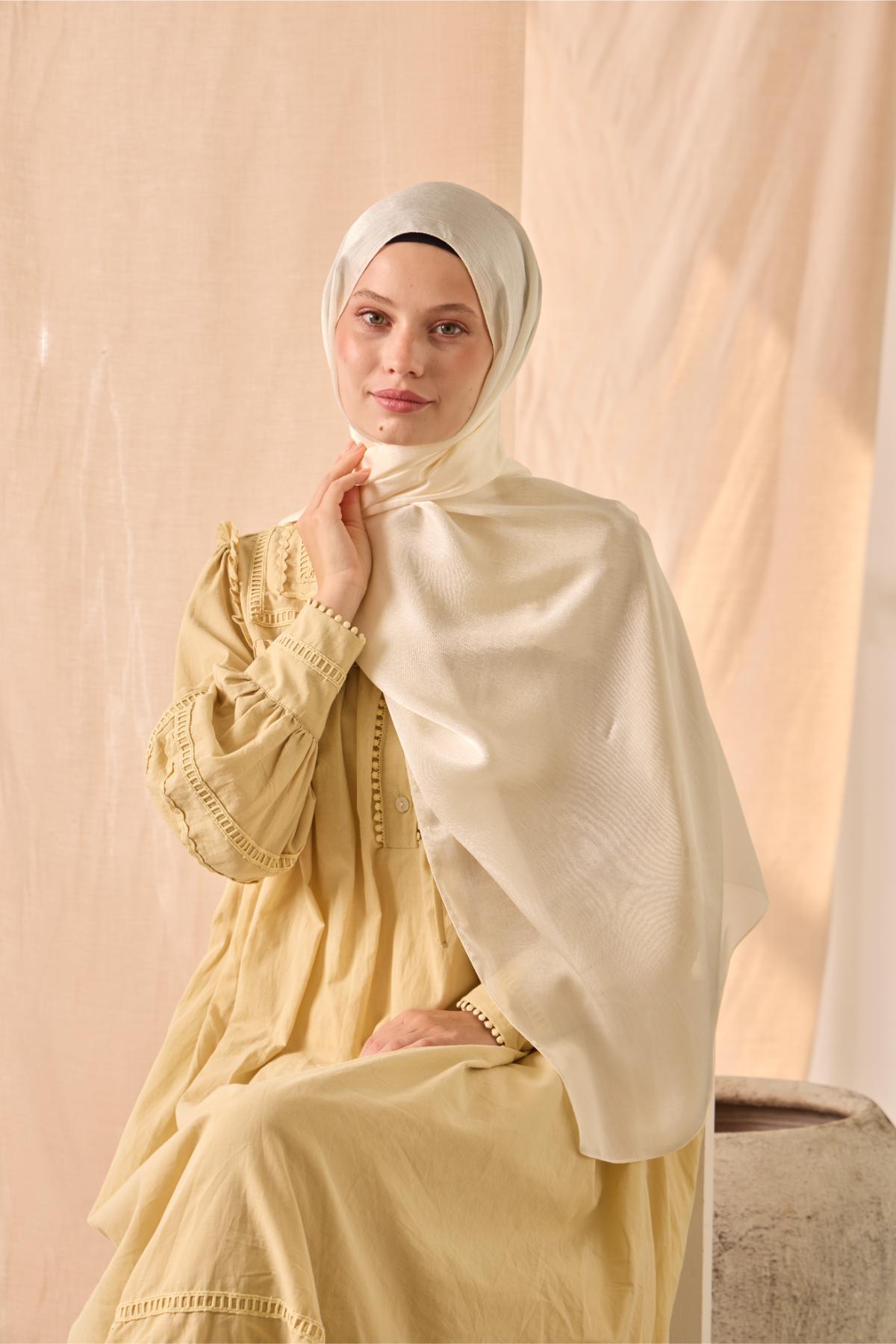 Ekru rengin doğal ve yumuşak tonunu yansıtan tek taraflı janjan şal, kendinden çizgi dokulu parlak yüzeyiyle abiyelik kombinlerde sade ama dikkat çekici bir görünüm sunar. Işığı dengeli şekilde yansıtan yapısı, ekru tonun matlaşmadan formunu korumasına yardımcı olur.