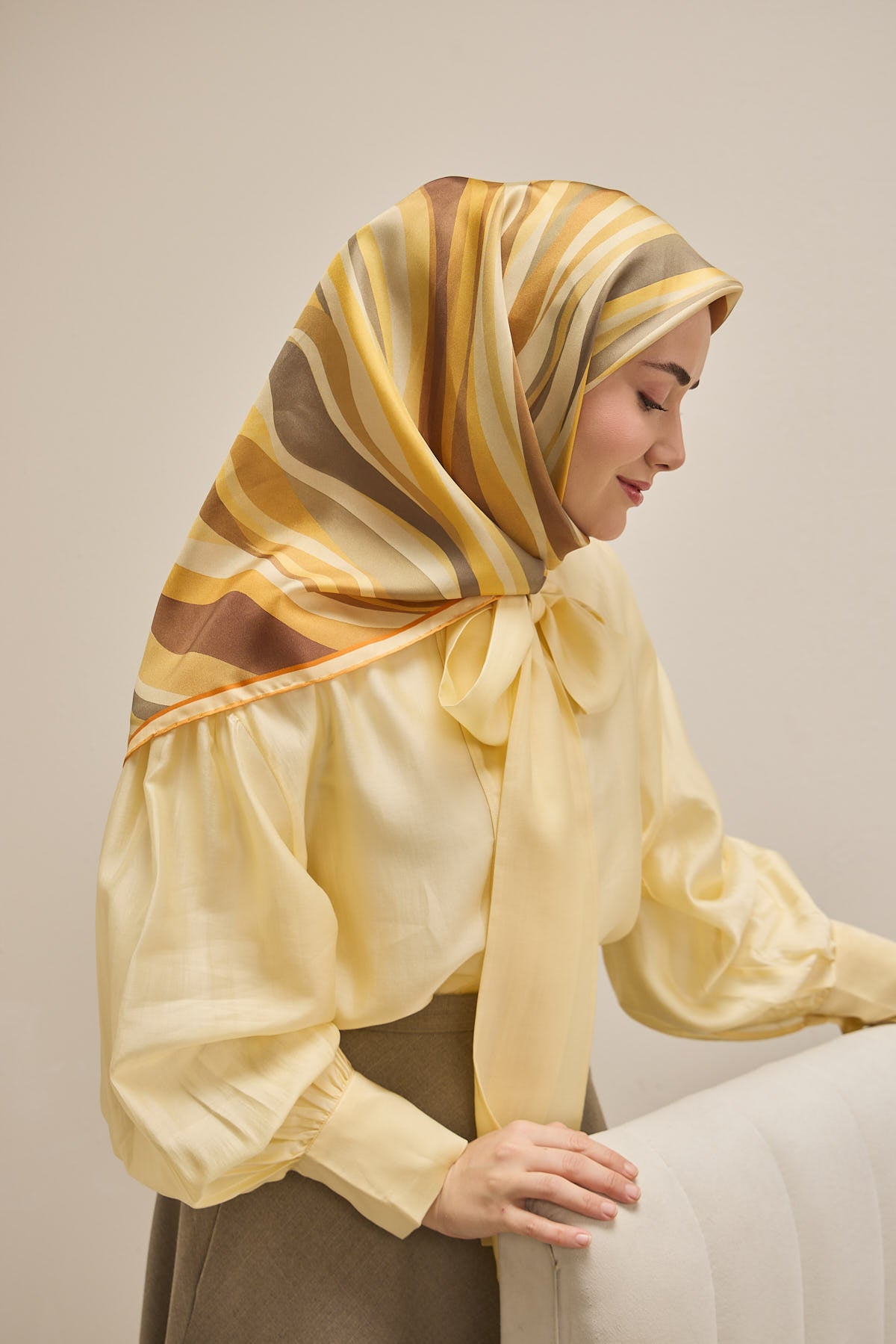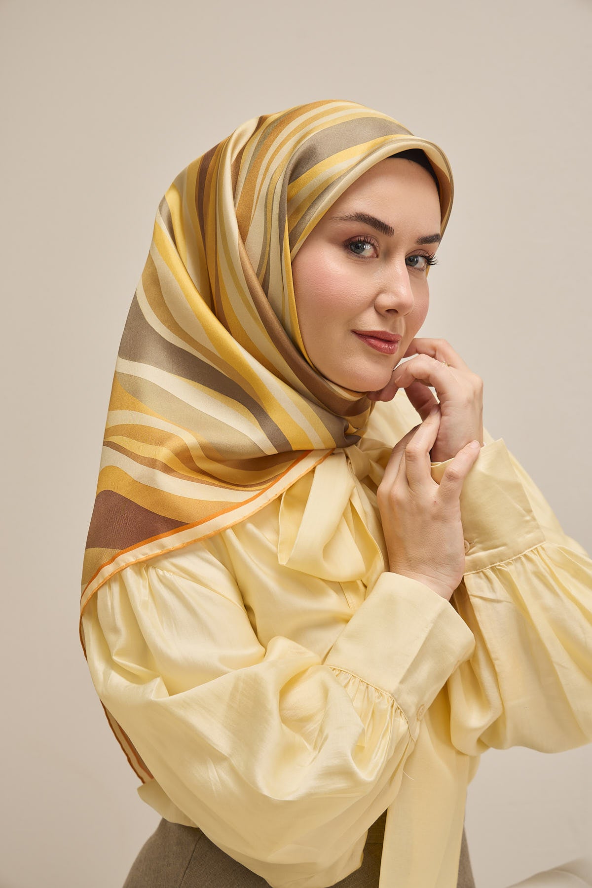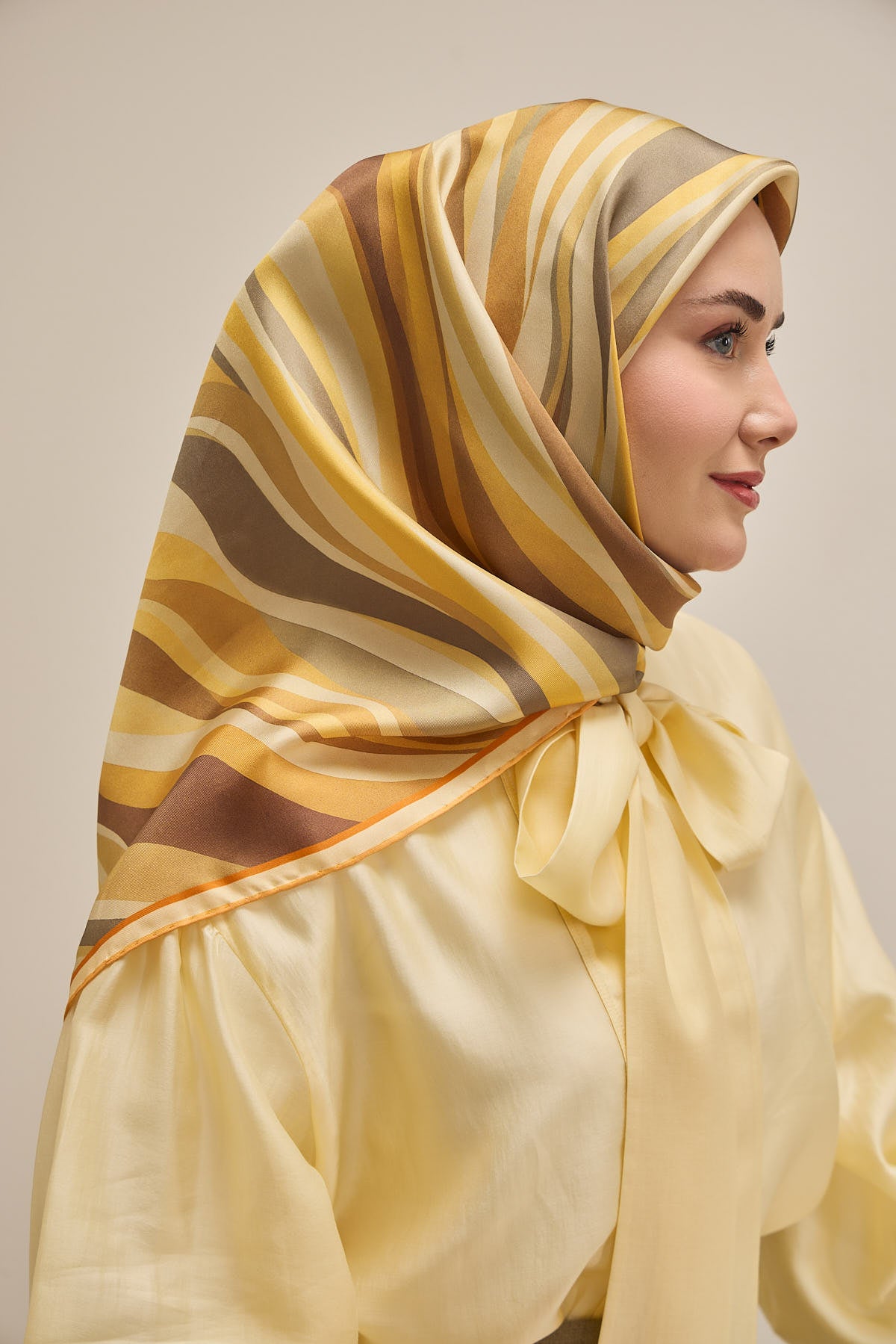 Reflecting the natural harmony of navy, blue, and green tones, this twill silk scarf is an ideal choice for those who want to maintain its shape throughout the day thanks to its firm structure. The non-slip fabric feature offered by the twill weave allows the scarf to easily take shape on the head and minimizes the feeling of it slipping during the day.