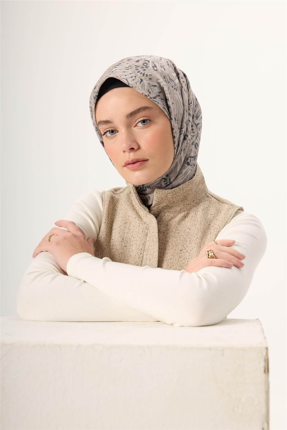 Açık vizon, antrasit, gümüş ve krem tonlarının dengeli şekilde kullanıldığı desenli yüzey, sade ve doğal kombinlerle kolay uyum sağlar. Kaymaz pamuk eşarp arayanlar için kolay şekil alan yapısı sayesinde pratik bir kullanım sunar.