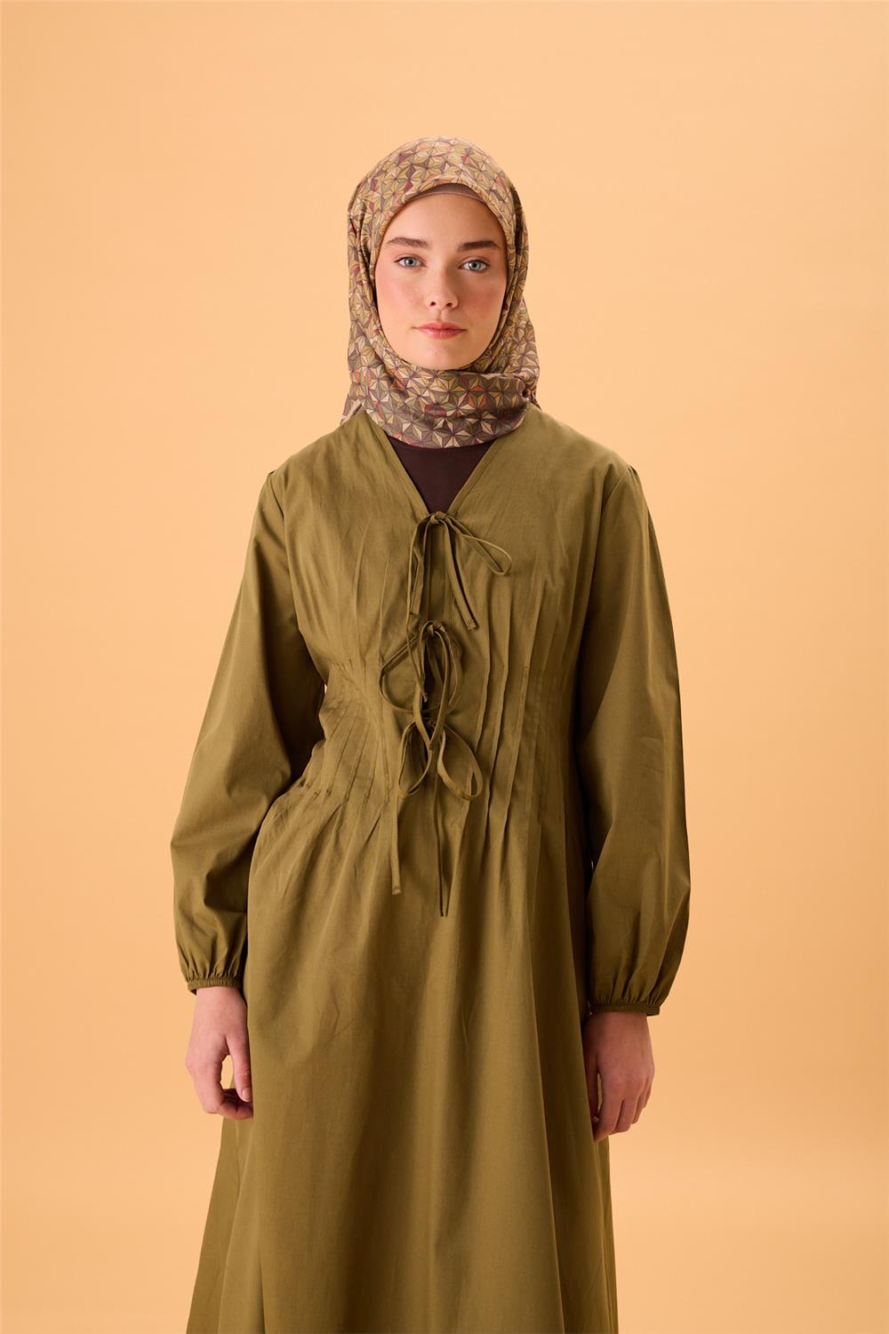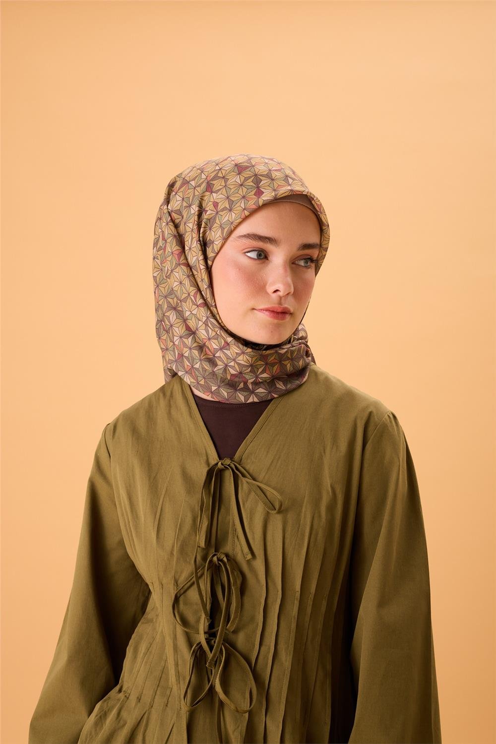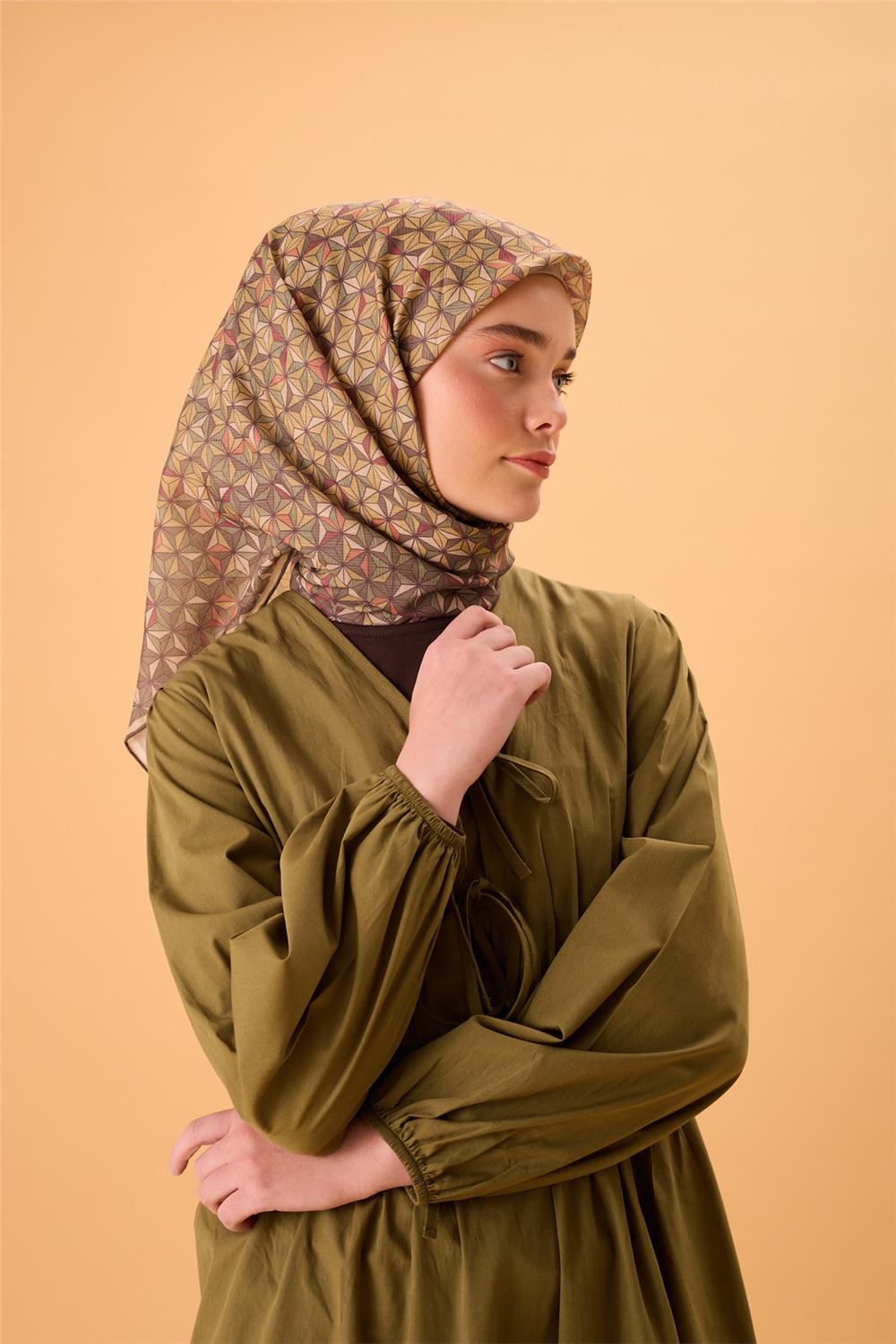 İnce Pamuk Soft Eşarp Haki Sarı Turuncu Bordo Desenli Kaymaz Dokulu Tok Duruşlu 90X90