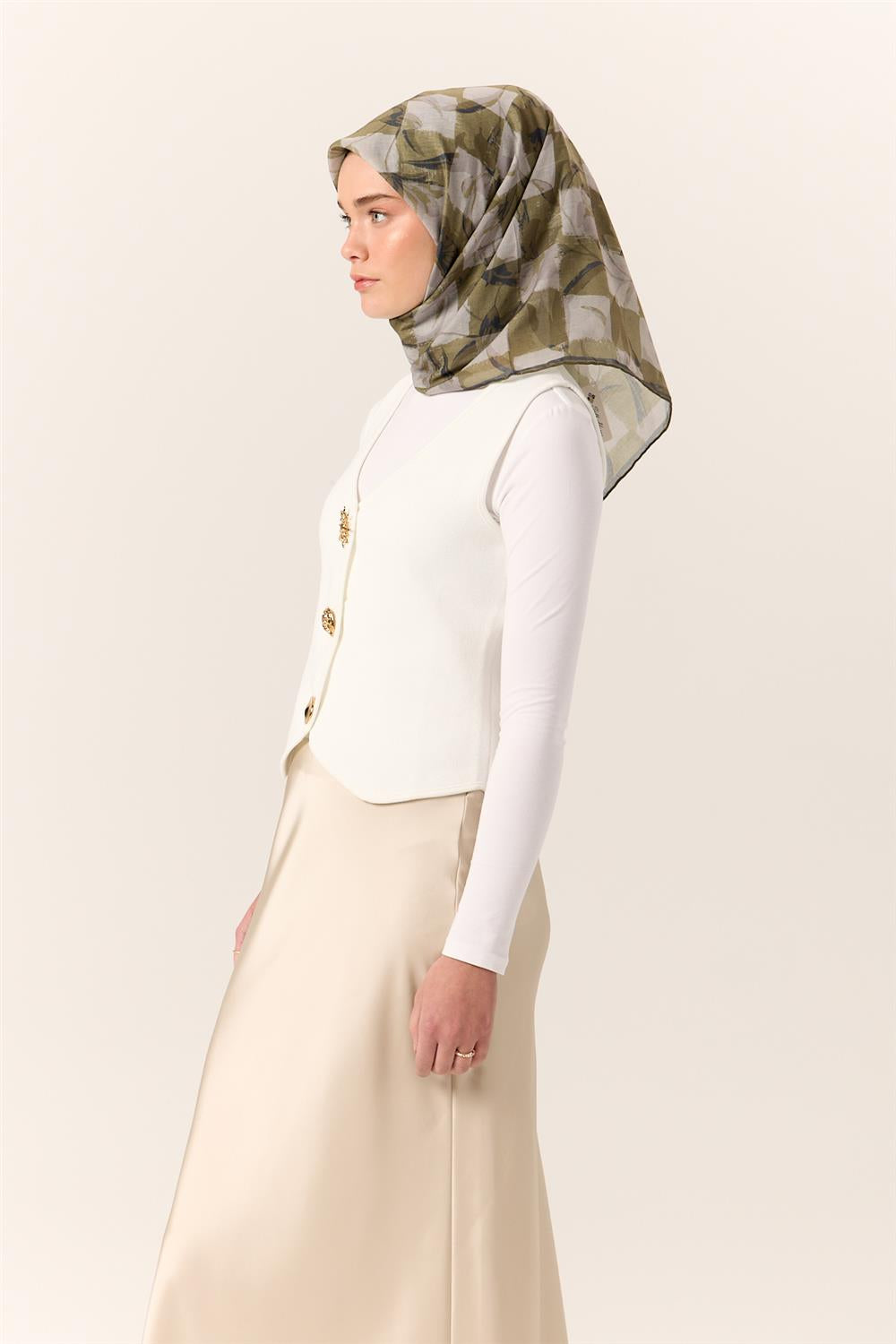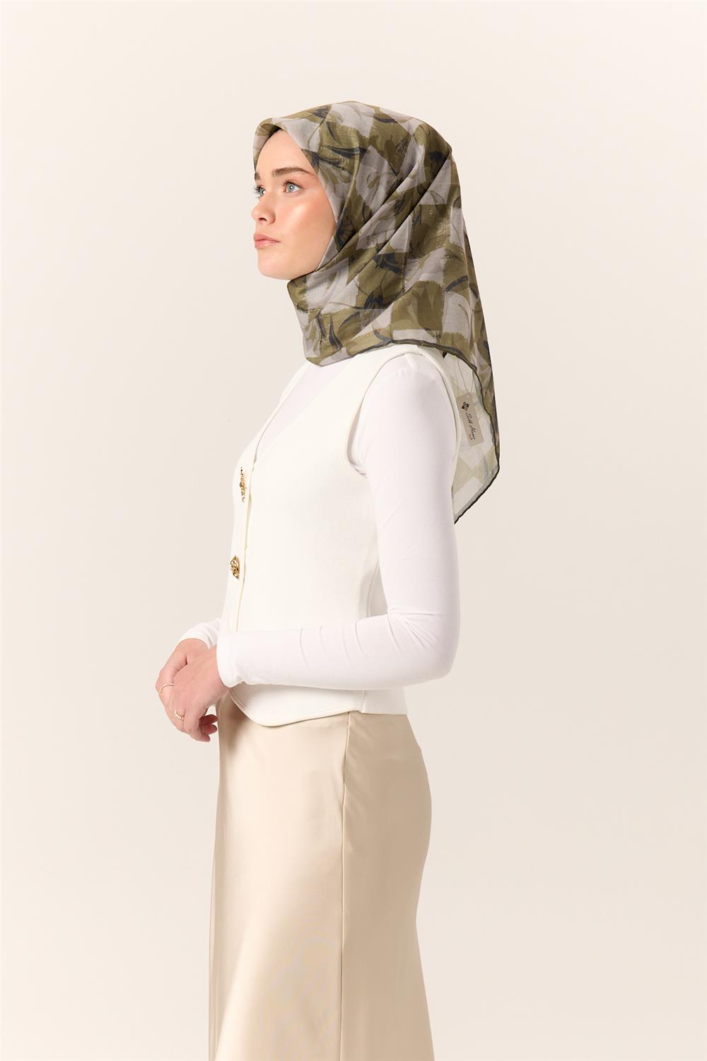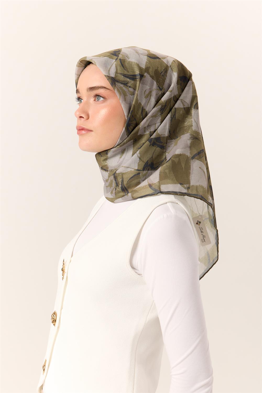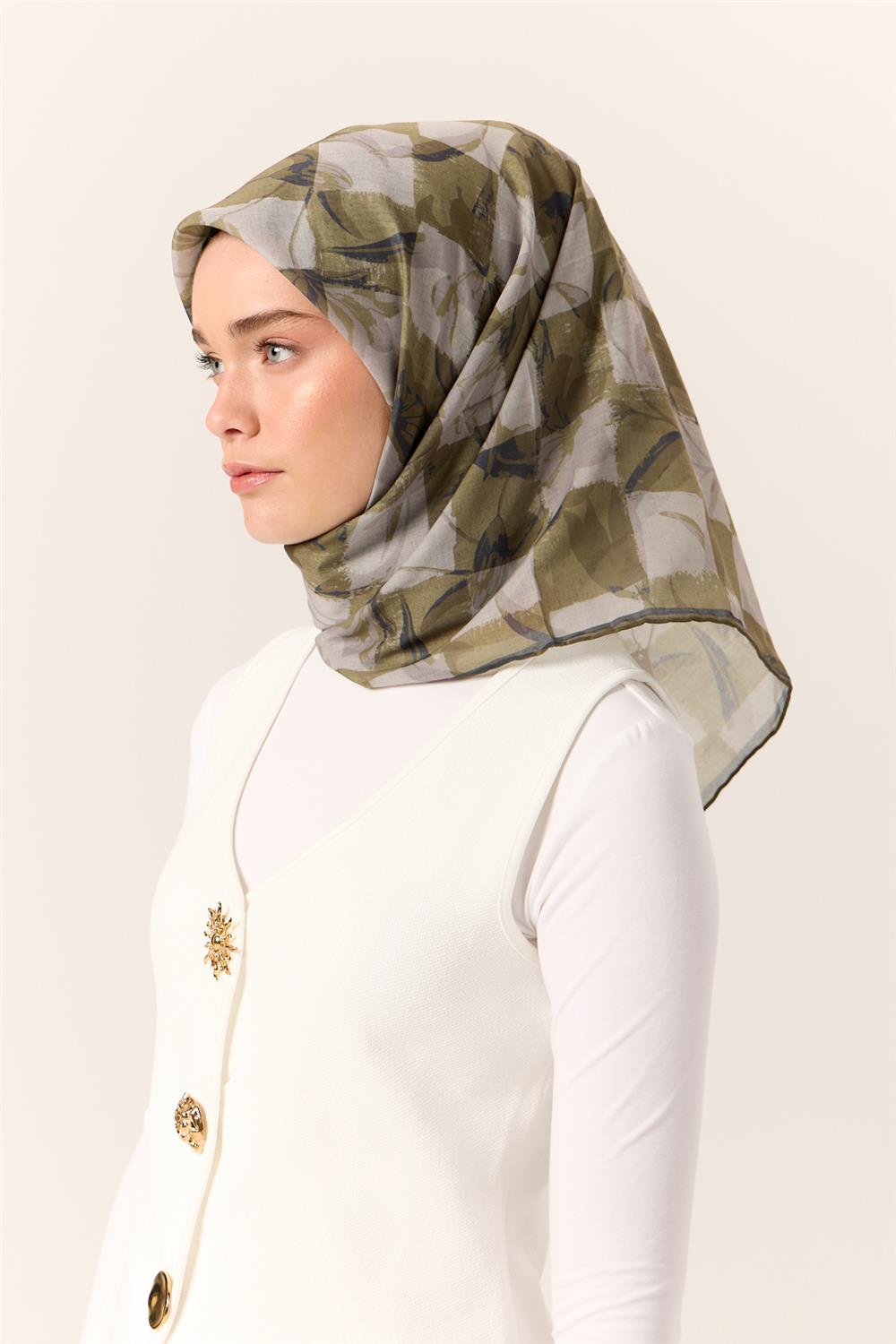 Pamuk soft eşarp koleksiyonunda doğal yeşil tonlarıyla öne çıkan bu model, kaymaz dokulu yapısı sayesinde gün boyu başta sabit ve düzenli bir kullanım sunar. Kına yeşili, koyu yeşil ve yeşil bej tonlarının desenli yüzeyde dengeli şekilde kullanılması, sade ve zamansız kombinler için uyumlu bir görünüm oluşturur.