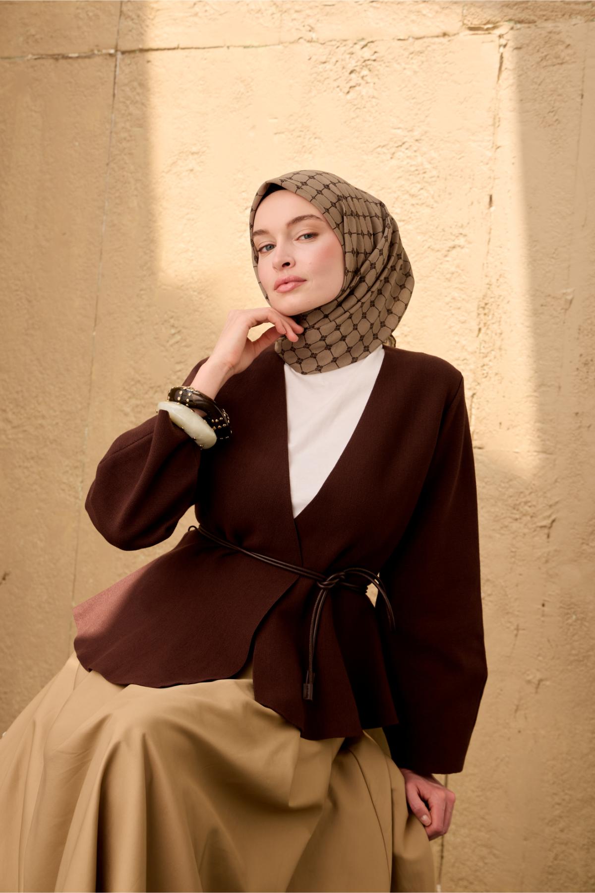 Koyu vizon ve acı kahve tonlarının uyumlu birlikteliğiyle hazırlanan desen, hem açık hem koyu kombinlerle rahatlıkla eşleşir. Pamuk floş eşarp dokusu sayesinde başta ağırlık yapmaz, parlak dokulu yüzeyi ise ışığı dengeli şekilde yansıtır. Günlük kullanım, ofis stili ve mevsim geçişleri için ideal bir seçenektir.