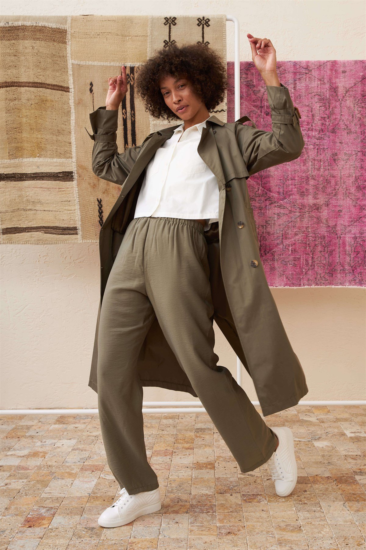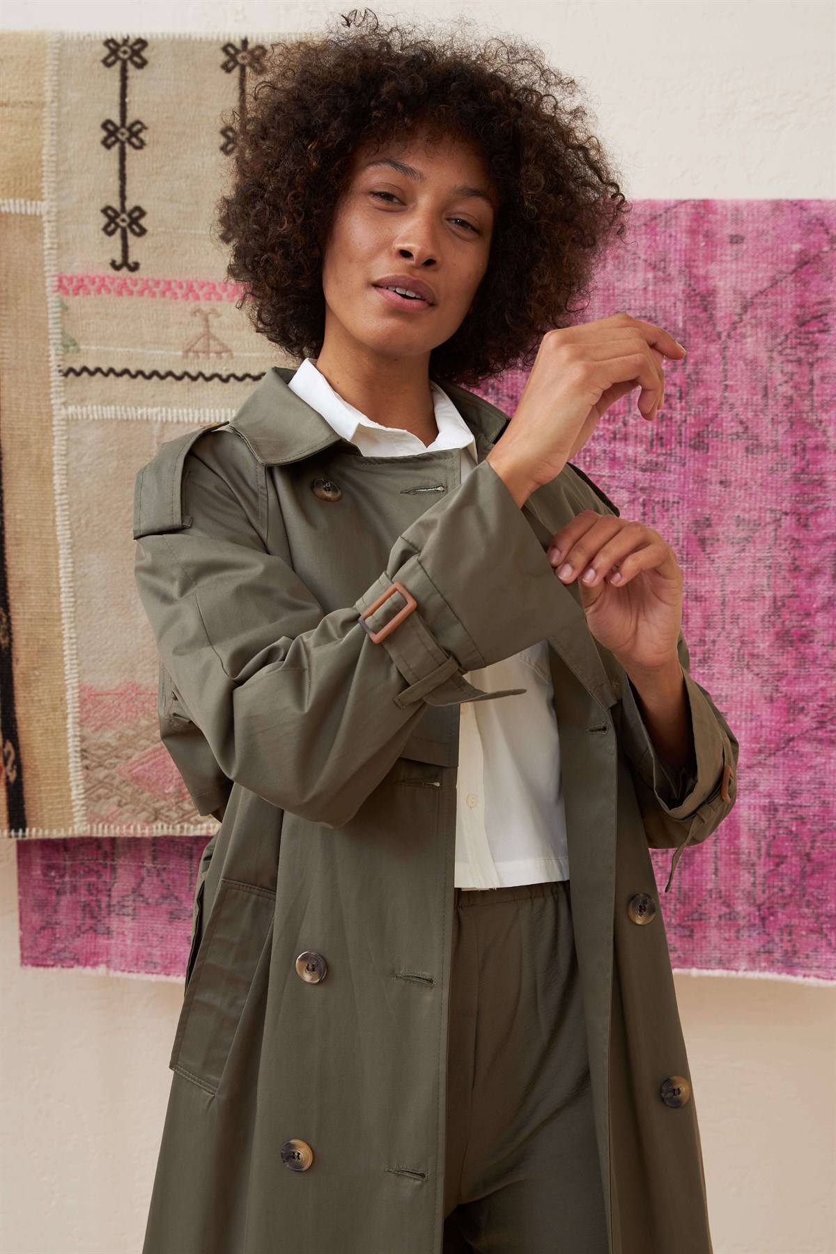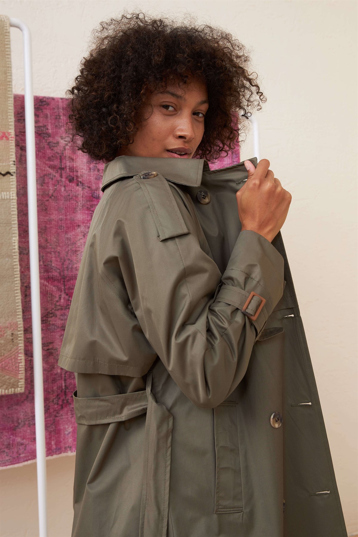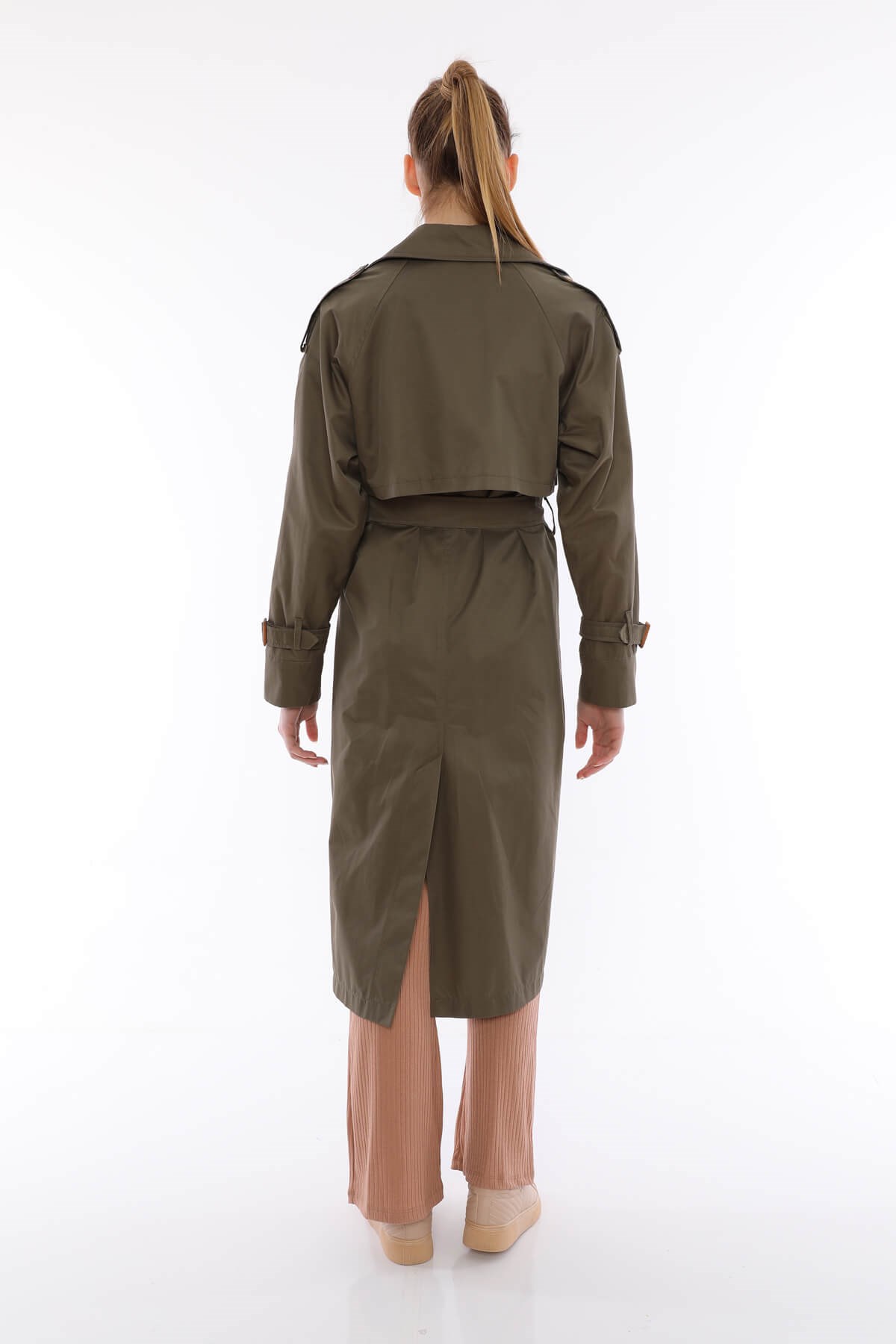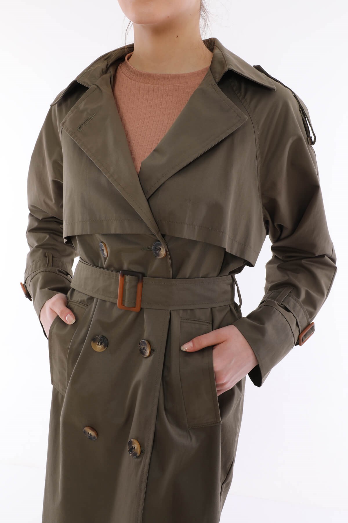 Ürün Özelliği: Seyyar Kemerli, Cepli, Çift Düğmeli, İç Astarlı, Kol ve Omuz Kemer Detaylı.